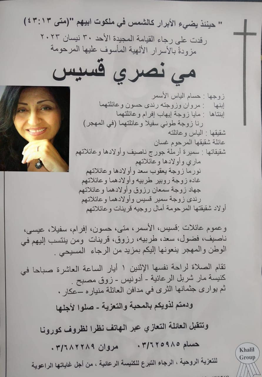 وكتبت مايا نصري عبر حسابها بفيس بوك: "ماما راحت عالسما.. بحبك يا ماما.. رح أشتاقلك"، وأعلنت مايا موعد تشييع الجنازة أو موعد إقامة العزاء.