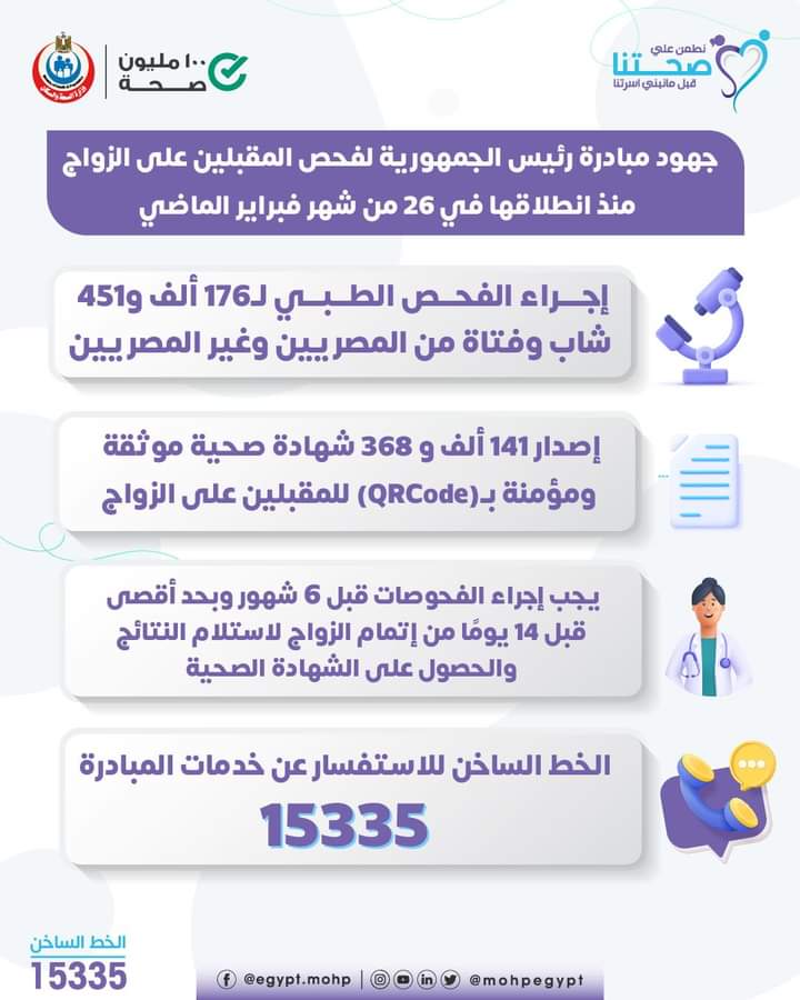 وأعلنت وزارة الصحة والسكان، إجراء الفحص الطبي لـ176 ألف و451 شاب وفتاة من المصريين وغير المصريين، ضمن مبادرة رئيس الجمهورية لـ«فحص المقبلين على الزواج»، خلال شهرين منذ انطلاقها في 26 من شهر فبراير الماضي، تحت شعار «100 مليون صحة».