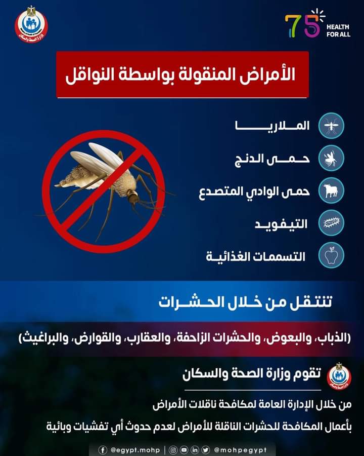 وكشفت وزارة الصحة عن جهود مكافحة الأمراض المنقولة سواء عن طريق الحشرات والبعوض والذباب والبراغيث والحشرات الزاحفة لمنع حدوث أي تفشيات وبائية.