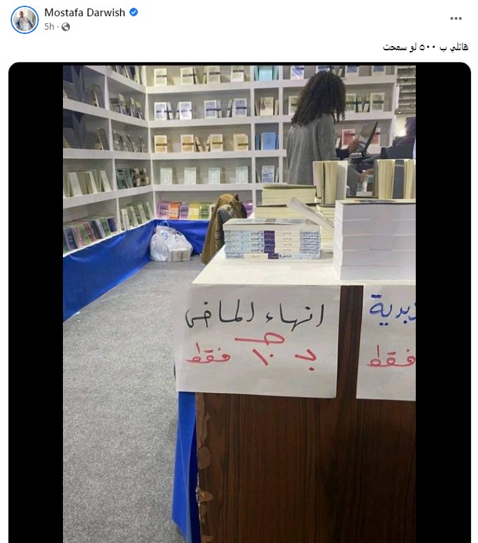مصطفى درويش، كتب الفنان مصطفى درويش قبل وفاته بـ5 ساعات تدوينة يمازح فيها متابعيه، علي صفحته بالفيس بوك، حيش نشر صورة لمكتبه، وبها كتب بعنوان "إنهاء الماضي"، فعلق على الصورة مازحًا أنه يريد 500 نسخة من كتاب إنهاء الماضي.