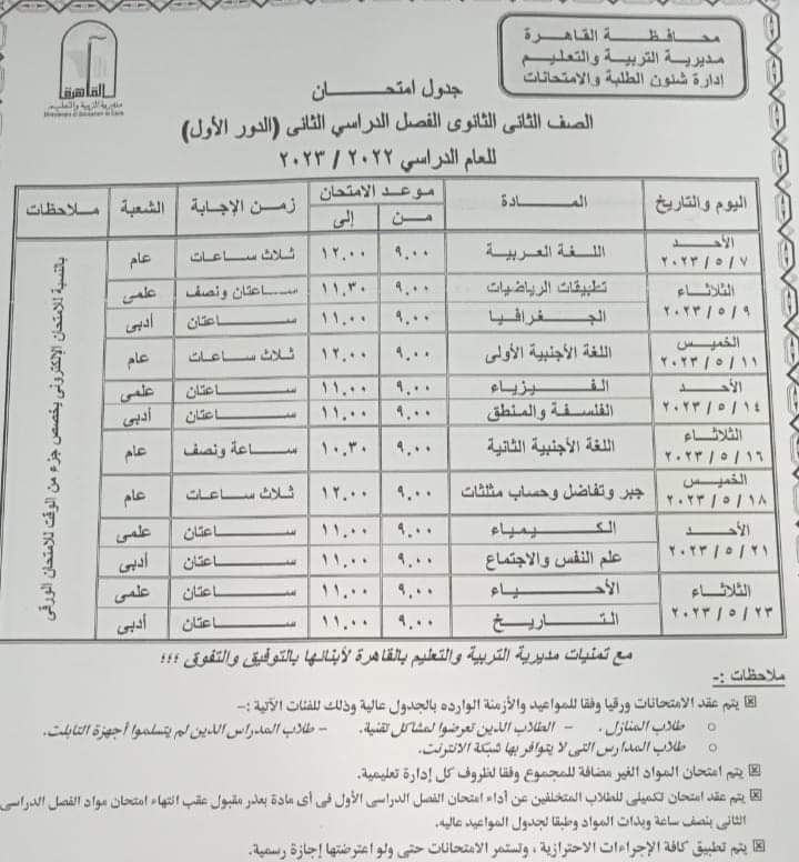جدول امتحانات الصف الثاني الثاني بالقاهرة