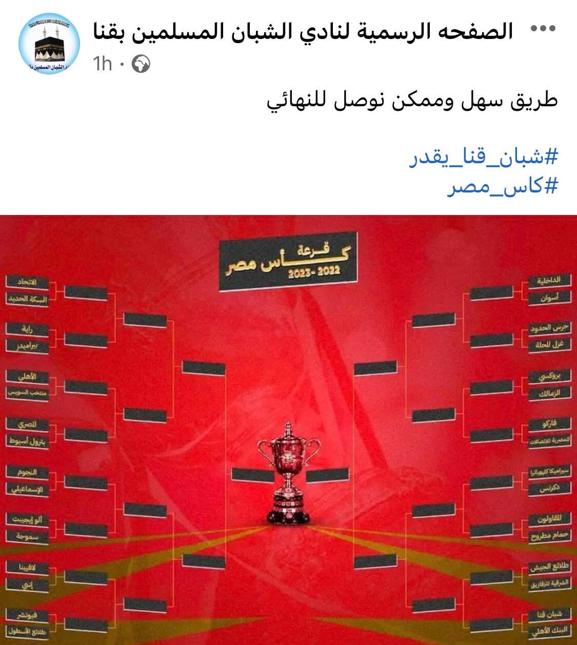 وفي أول تعليق لنادي شبان قنا عن نتيجة قرعة كأس مصر نشرت الصفحة الرسمية لفريق الشبان جدول قرعة كأس مصر ودونت عليها: “طريق سهل، وممكن نوصل للنهائي”.