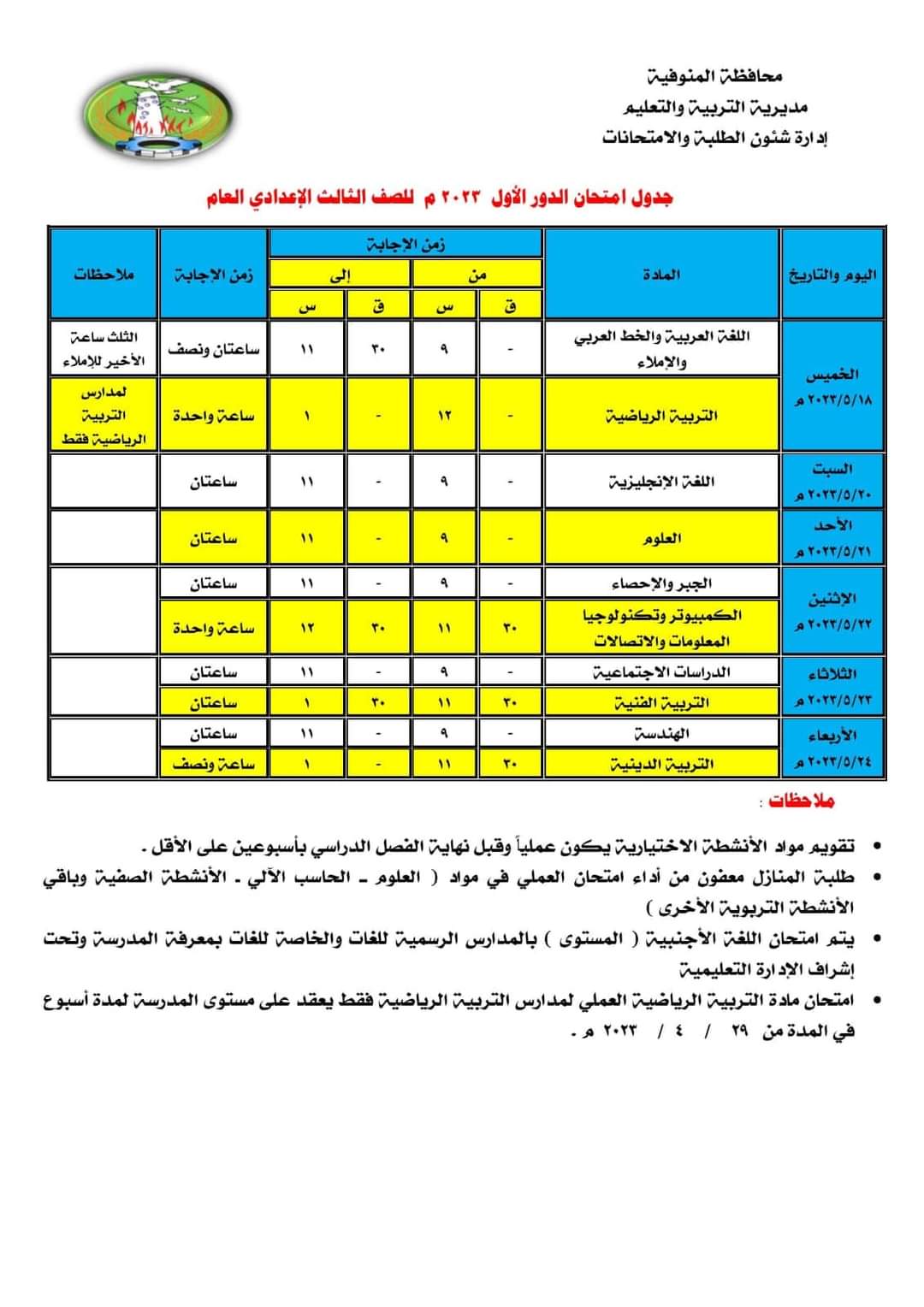 جدول امتحانات الفصل الدراسى الثانى للصف الثالث الإعدادى بالمنوفية 2023