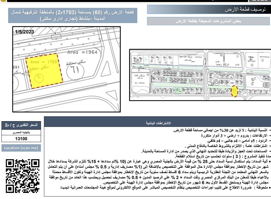 وشددت هيئة المجتمعات العمرانية الجديدة على ضرورة طلب كراسة الشروط والمواصفات من مقر الجهاز نظير سداد مبلغ (299 جنيهًا) مائتين وتسعة وتسعين جنيهًا لكل محل، مشيرة إلى إمكانية المعاينة على الطبيعة في مواعيد العمل الرسمية لكل من يرغب في دخول المزاد.