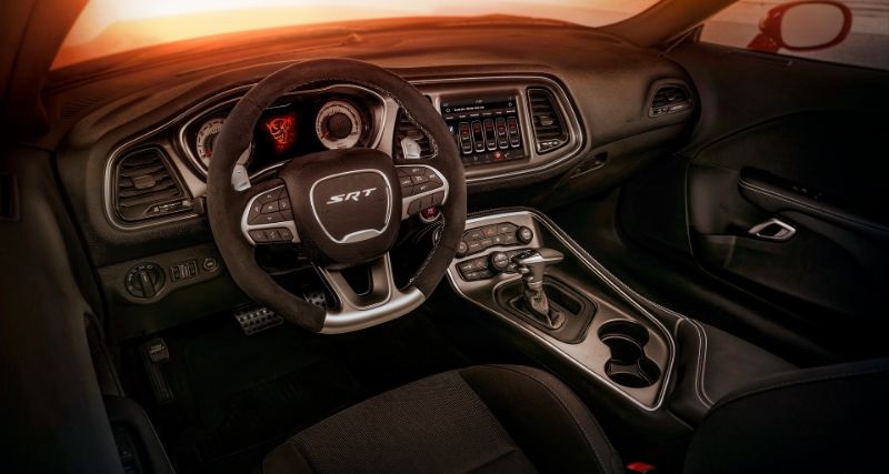 بمجرد دخولك للمقصورة، فستلاحظ مقود السيارة من الكانتارا أو الجلد ومتعدد الوظائف مع وجود شعار أو بصمة SRT على مقود السيارة، كما أن مقود السيارة يوجد في خلفه شيفتات لتبديل السرعة، مع وجود عدادات أنالوج مستمدة من السيارة الكلاسيكية تُعطي طابع رياضي مميز بالرغم من كونها قديمة، كما أن السيارة يوجد بها شاشة ترفيهية بقياس 7 بوصة تدعم آبل كار بلاي وأندرويد أوتو مع بلوتوث، كما أن السيارة مصممة أيضًا لإعطاء راحة مميزة بالنسبة لسيارة رياضية بمثل هذا المحرك الكبير، وهي السيارة الوحيدة في هذه الفئة التي تتوفر بـ5 مقاعد لتكون مريحة أكثر من أي سيارة أخرى في هذه الفئة التي تنافس فيها دودج تشالنجر.