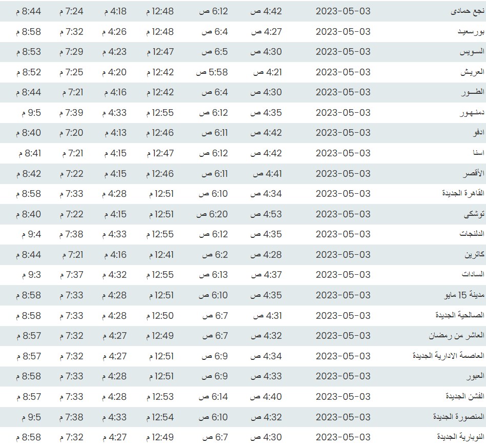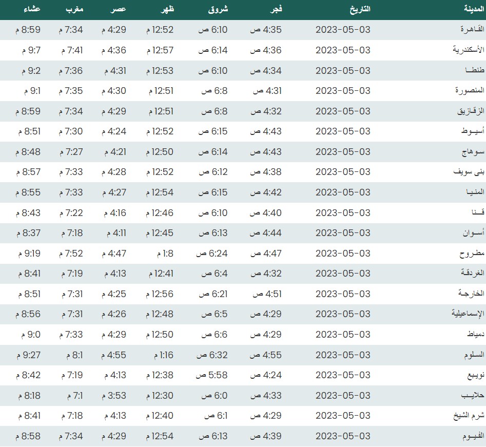مواقيت الصلاة اليوم الأربعاء 3 - 5 - 2023 في القاهرة والمحافظات