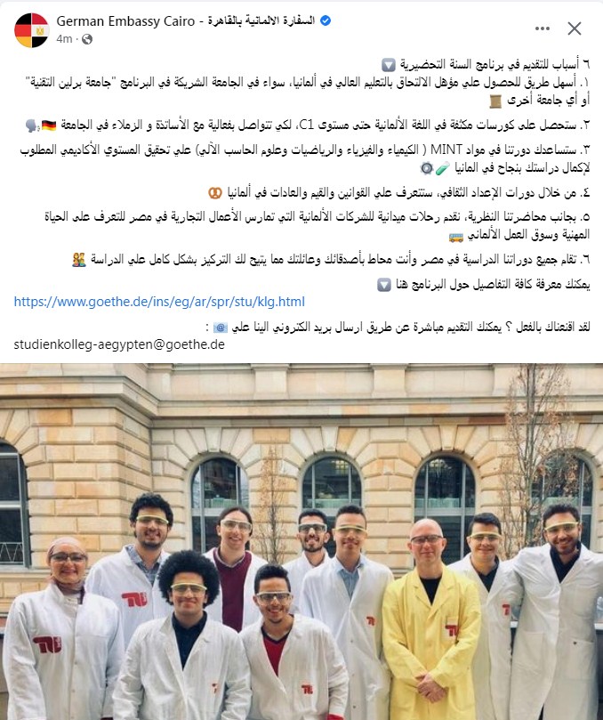 وعن الدراسة في ألمانيا، كشفت السفارة الألمانية في القاهرة عن ٦ أسباب للتقديم في برنامج السنة التحضيرية، وذلك للدراسة في جامعات ألمانيا المختلفة، حيث تقدم السفارة رحلات ميدانية للشركات الألمانية التي تعمل في مصر للتعرف على الحياة المهنية وسوق العمل في ألمانيا.