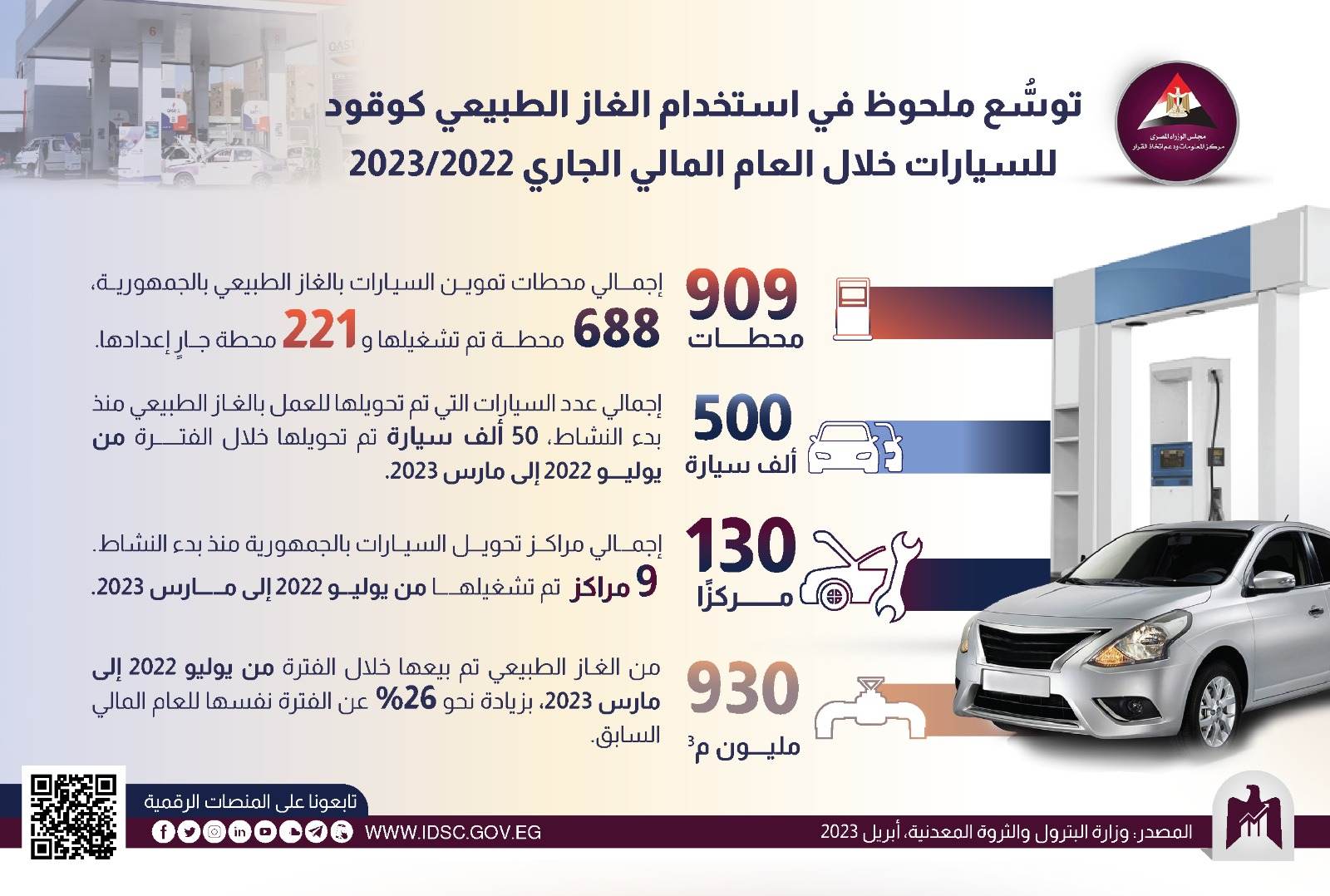 كما تم تحويل نحو 50 ألف سيارة خلال الفترة من يوليو 2022 حتى مارس 2023 ليصل إجمالي عدد السيارات التي تم تحويلها منذ بدء نشاط التحويل إلى حوالي 500 ألف سيارة، كما تم تشغيل 9 مراكز تحويل للسيارات خلال الفترة نفسها ليصل الإجمالي إلى نحو 130 مركزًا للتحويل لخدمة العملاء على مستوى الجمهورية منذ بدء النشاط، وذلك وفقًا لخطط وبرامج ناجحة نفذها قطاع البترول على مدار العامين ونصف الماضيين لزيادة معدلات تحويل السيارات للعمل بالغاز وتحقيق الانتشار لمحطات تموينها على مستوى الجمهورية.