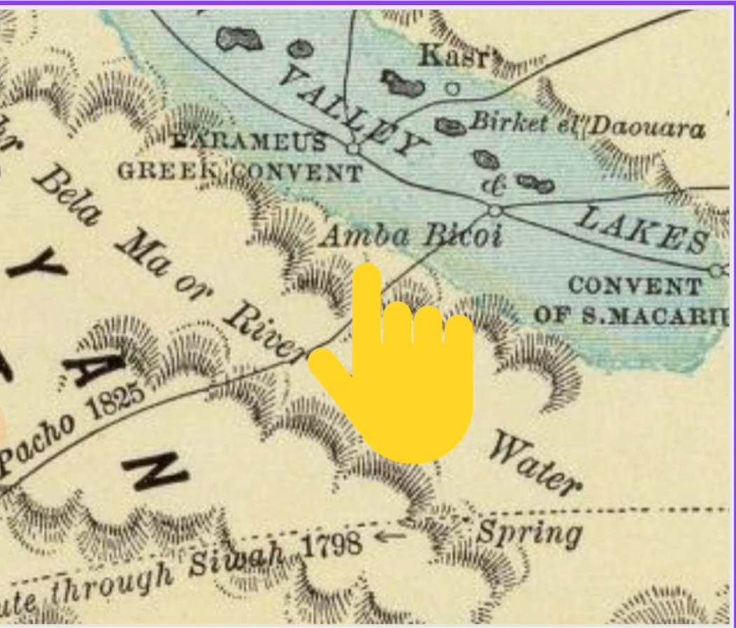 واستطرت هايدي فاروق قائلة: "ثم يسير المسار إلى أسفل دير الأنبا مقار في طنببول عند طريق مصر الاسكندرية الصحراوي، حيث كنت قد جلبت منذ اعوام عينة من مياه ذلك المسار في تلك النقطة وقبيل معالجتها، وجاء التحليل بأنها مياه عذبة ونقية وصالحة للشرب ومن تلك النقطة يسير مسار النهر ليظهر جليا عند منطقة بير ناصف، من خلال بحيرة عذبة تسمى بركة الفاسدة، عند إحداثيات 30 19 27 شمال، 30 24 34 شرق"
