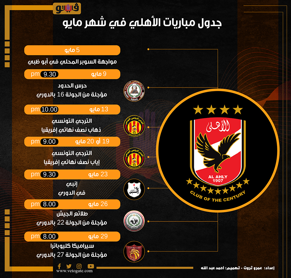 جدول مباريات الأهلي في شهر مايو (إنفوجراف)