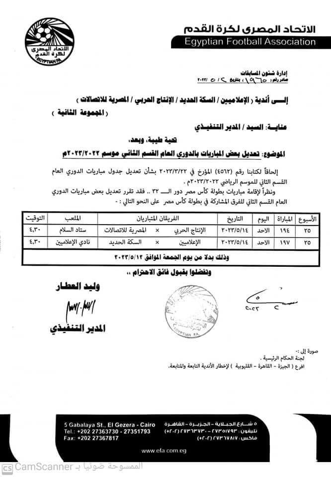دوري القسم الثاني، أبلغت لجنة مسابقات دوري القسم الثاني بالاتحاد المصري لكرة القدم أندية الإعلاميين والسكة الحديد والإنتاج الحربي والمصرية للاتصالات بتغيير موعد مباراة الجولة الخامسة والعشرين من دوري القسم الثاني.