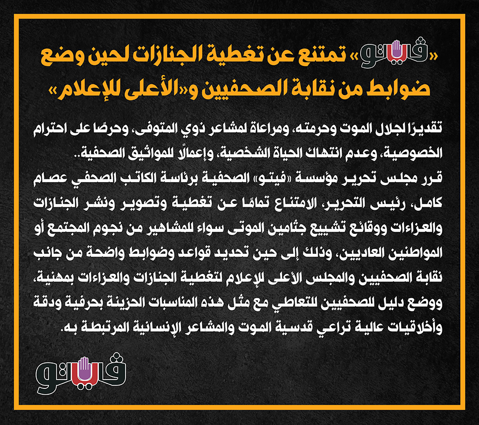 وكان مجلس تحرير فيتو، برئاسة الكاتب الصحفي عصام كامل، قرر الامتناع عن تغطية الجنازات والعزاءات، لحين وضع نقابة الصحفيين والمجلس الأعلى للإعلام، ضوابط وقواعد محددة فى هذا الشأن.