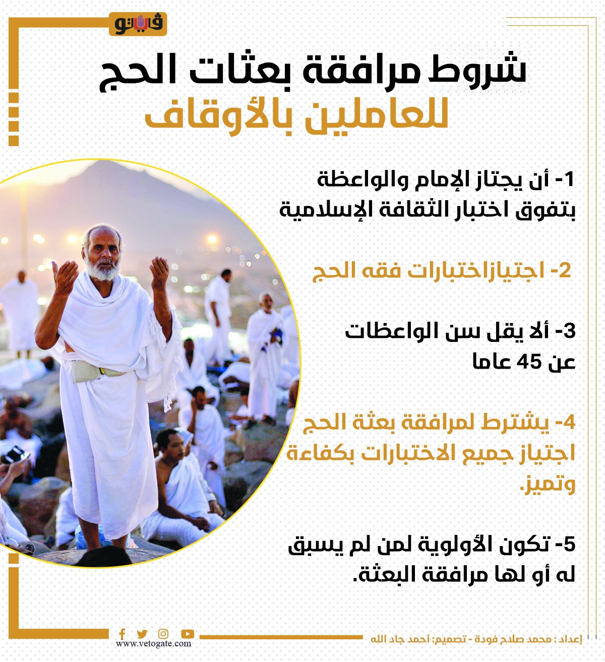 شروط مرافقة بعثات الحج للعاملين بالأوقاف (إنفو جراف) الأربعاء 10/مايو/2023 - 06:51 م 5/10/2023 6:51:03 PM بعثات الحج، فيتو - محمد صلاح فودة شارك طباعة 18 حجم الخط شارك طباعة مرافقة بعثات الحج مسابقة بعثات الحج وزارة الأوقاف الأوقاف