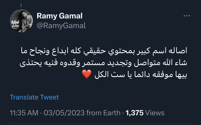 وكتب رامي جمال قائلا: "أصالة اسم كبير بمحتوى حقيقي كله إبداع ونجاح ما شاء الله متواصل وتجديد مستمر وقدوة فنية يحتذى بها موفقة دائما يا ست الكل".
