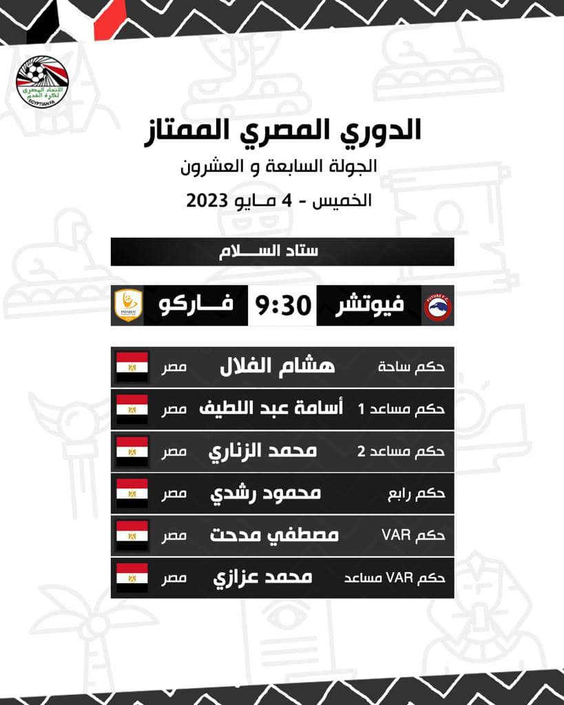 وتنطلق صافرة مباراة فيوتشر ضد فاركو في الدوري الممتاز الخميس المقبل في تمام الساعة التاسعة والنصف مساء باستاد السلام.