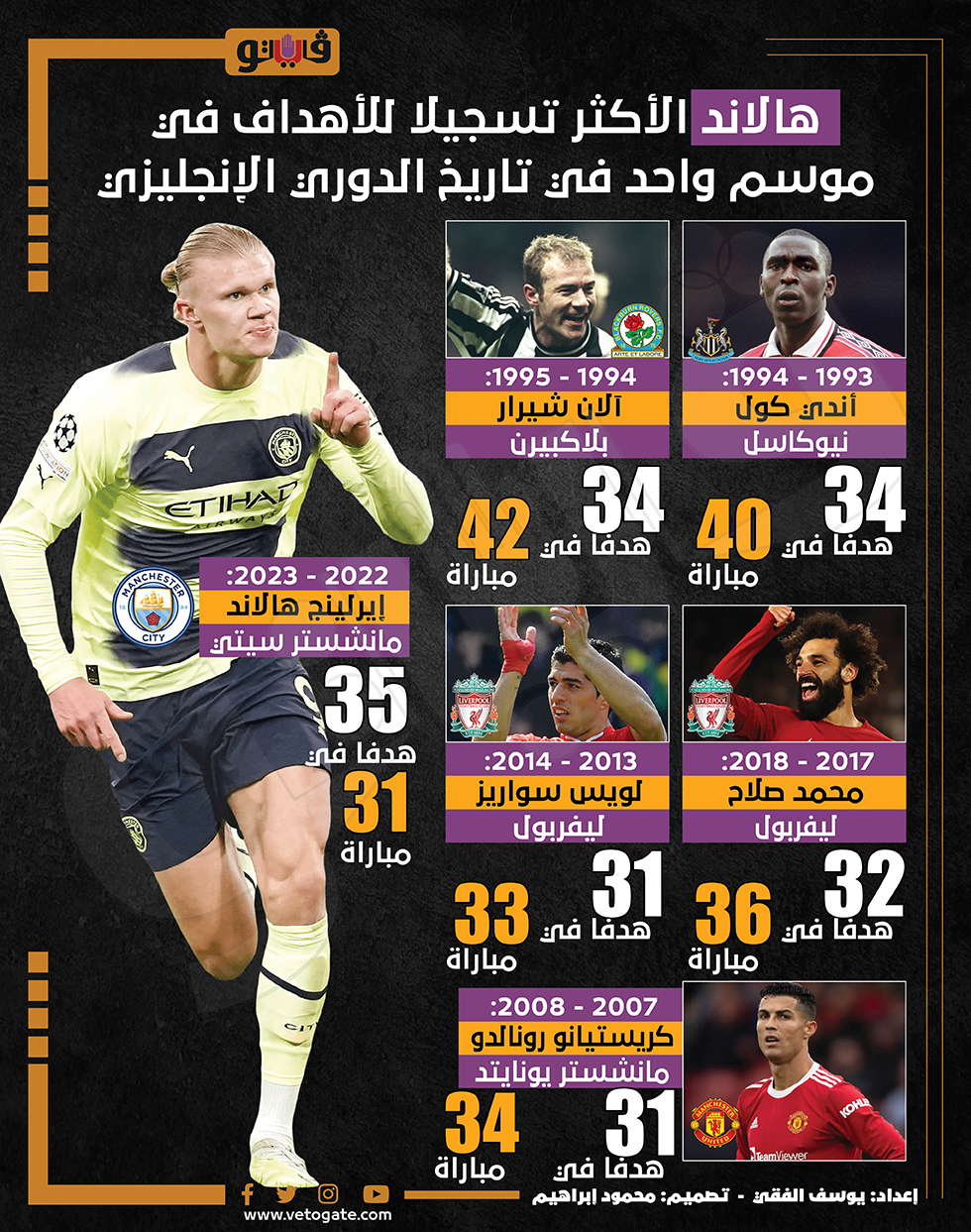 هالاند الأكثر تسجيلًا للأهداف في موسم واحد في تاريخ الدوري الإنجليزي (إنفوجراف)