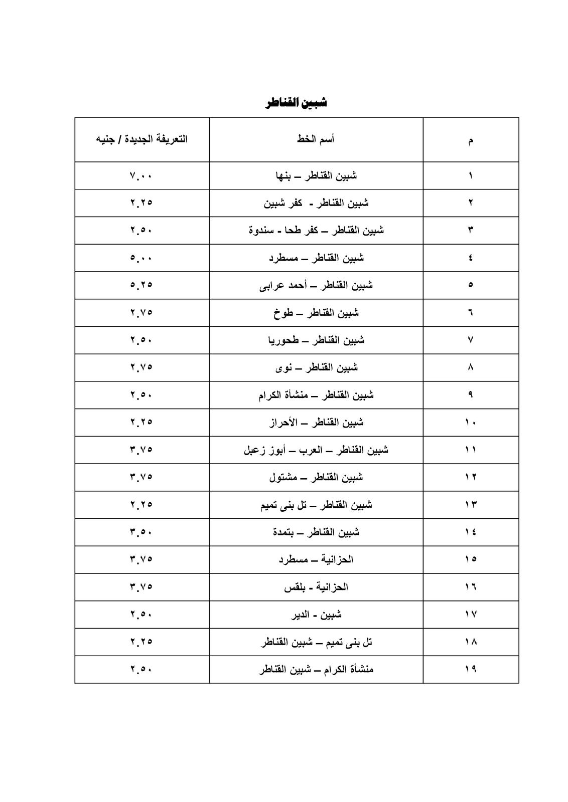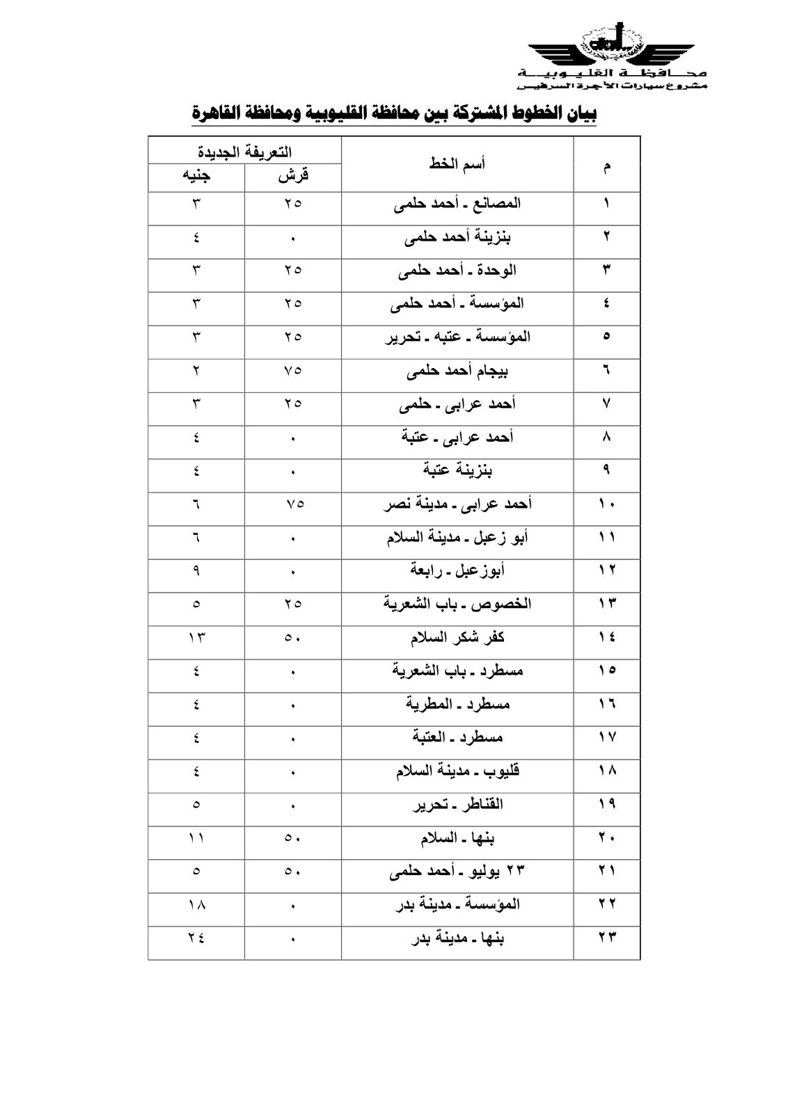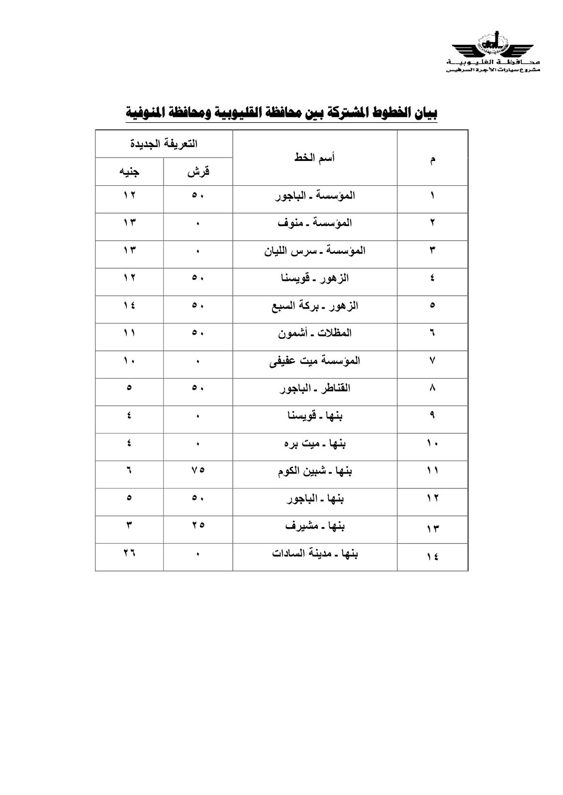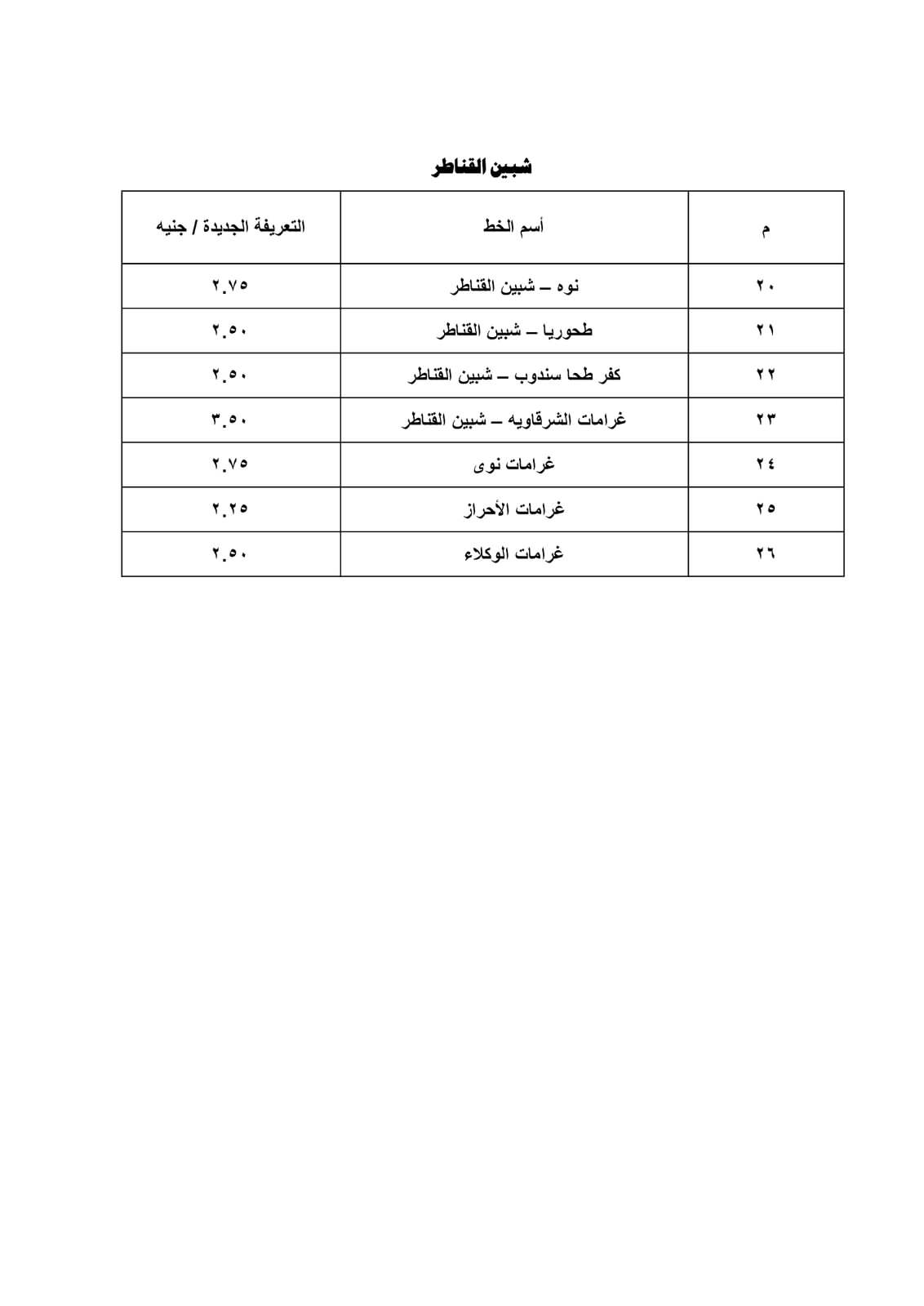 وأفاد محافظ القليوبية أن القرار الصادر نص على إلزام السائقين وأصحاب المركبات والسيارات بالتعريفة الجديدة مع تكليف مديري إدارة المرور ومدير مباحث المرور ومدير المواقف بتكثيف الحملات على سيارات ومركبات نقل الركاب بمختلف مواقف المحافظة وبالميادين المختلفة لمتابعة إلتزام السائقين بالتعريفة الجديدة
