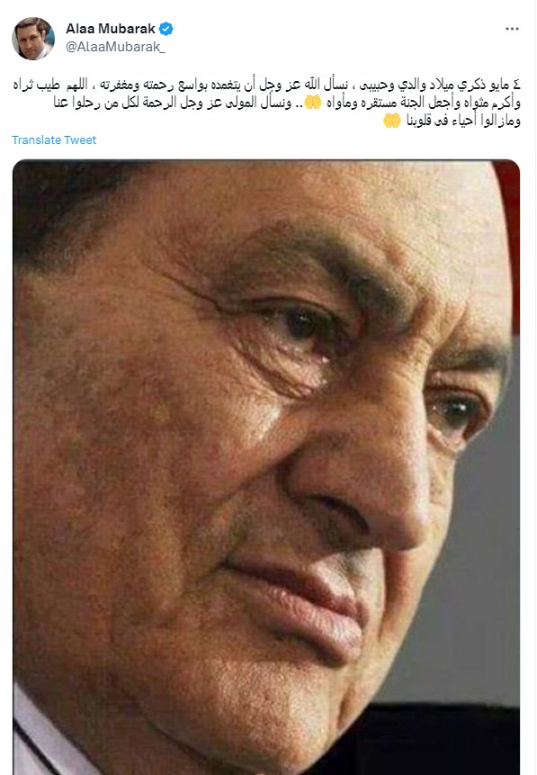 في ذكرى ميلاد حسني مبارك، كان دعاء علاء مبارك لوالده بأن يتغمده الله بواسع رحمته، ووصفه بأنه والده وحبيبه، داعيًا الله أن يجعل الجنة مستقره ومأواه.