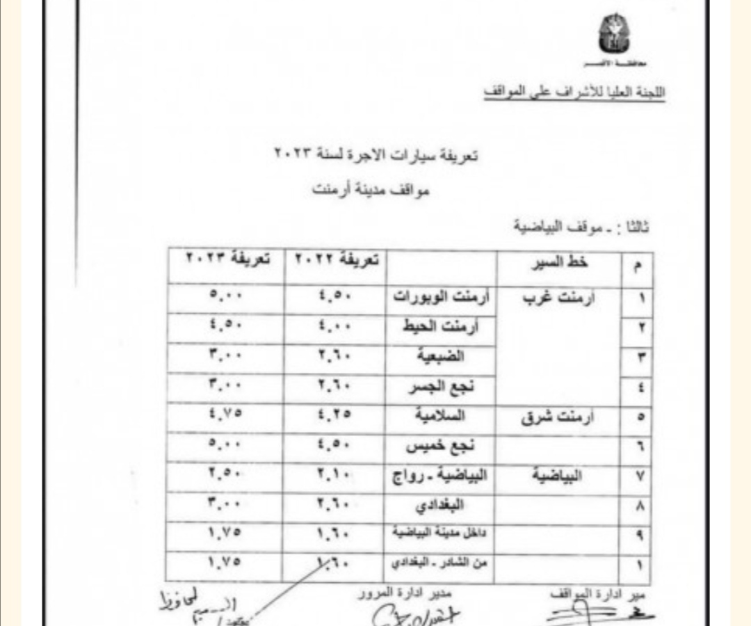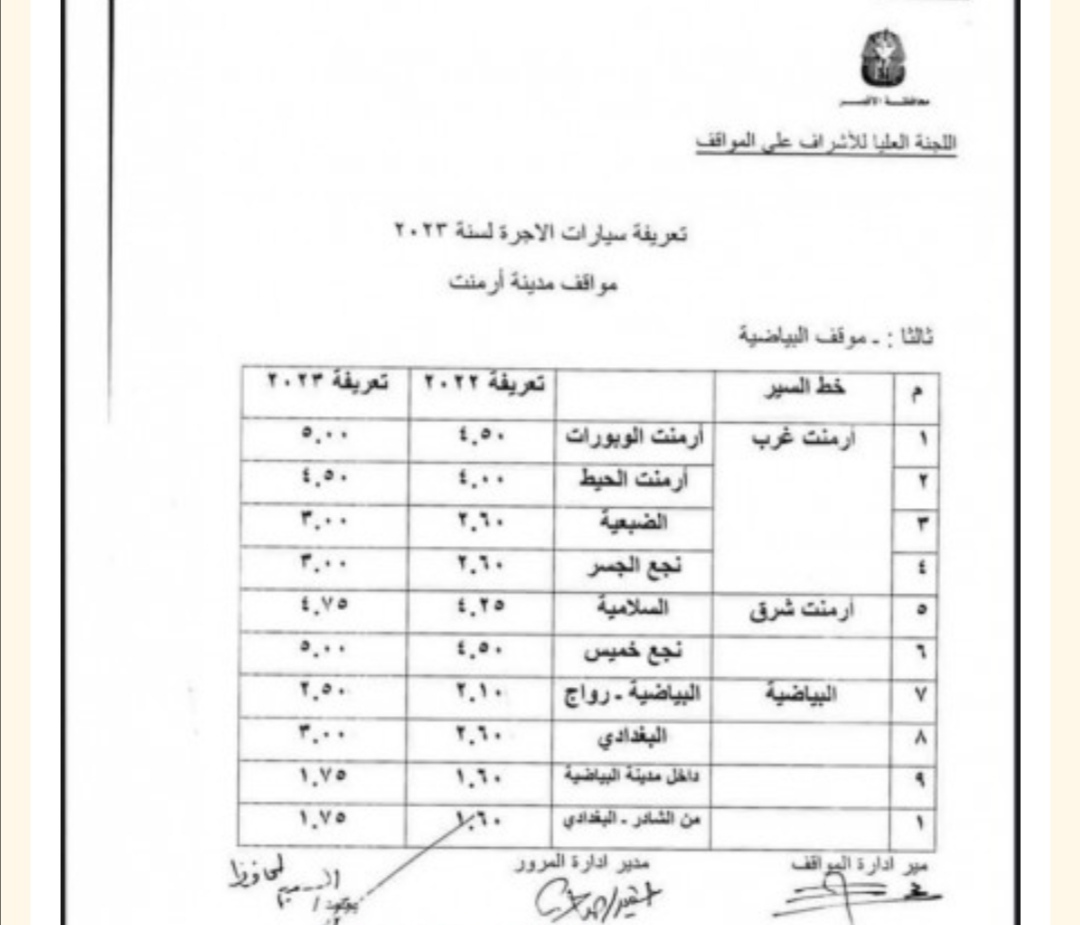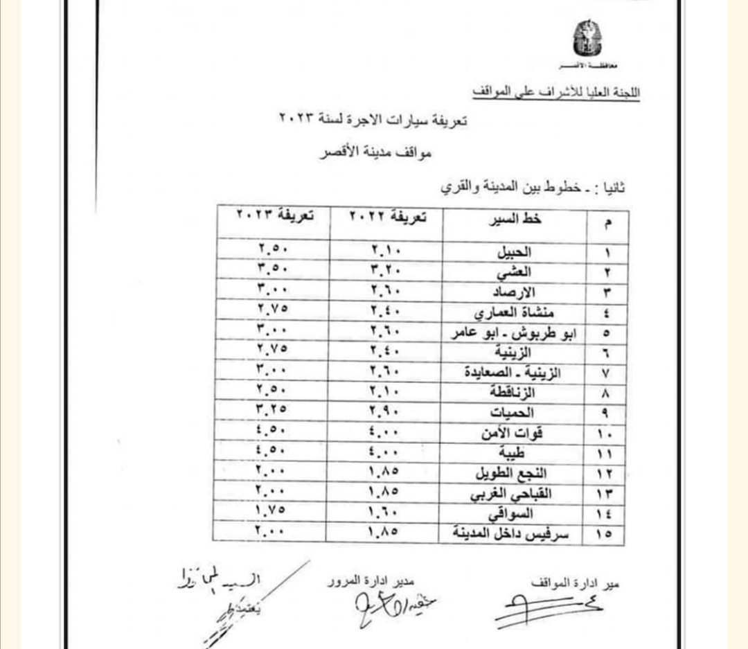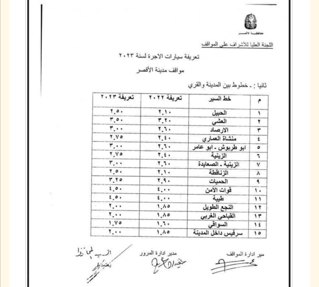 اعتمد المستشار مصطفي ألهم محافظ الأقصر قرار لجنة الإشراف على المواقف الخاص بزيادة تعريفة الركوب بنسبة ١٠%، واجتمعت لجنة الإشراف على المواقف برئاسة محمد عبد الفتاح سكرتير عام محافظة الأقصر وهدي مغربي سكرتير مساعد المحافظة وتضم مرور الأقصر ومباحث المرور وإدارة المواقف والتموين.