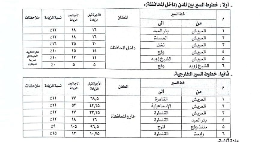 كانت محافظة شمال سيناء، أعلنت عن زيادة تعريفة الركوب علي الخطوط الداخلية والخارجية بالمحافظة مشيرة إلى توجيهات اللواء دكتور محمد عبدالفضيل شوشة محافظ شمال سيناء الذي أكد على متابعة العمل فى محطات الوقود والمواقف للتأكد من انتظام العمل والإلتزام بتعريفة الركوب الجديدة.