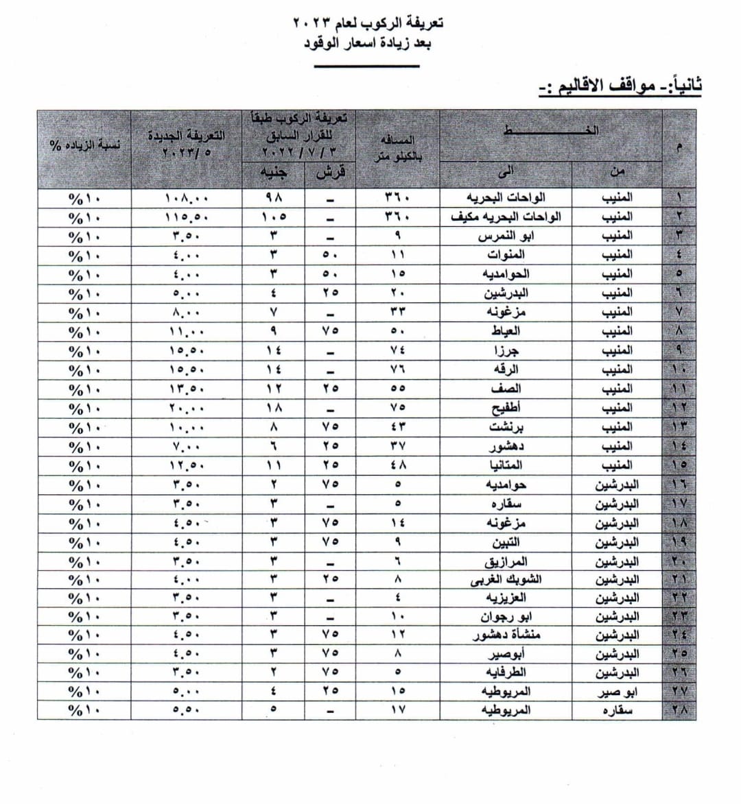 وقال محافظ الجيزة إن اللجنة التى تم تشكيلها لتعديل التعريفات وضعت فى اعتبارها مسافة كل خط سير وعدد الرحلات تحقيقًا للعدالة، مشيرًا إلى أن نسبة الزيادة لا تتعدى 10% لخطوط السرفيس الداخلية ولخطوط الأقاليم على أن يتم إعلان التعريفات الجديدة وتعليقها بكافة المواقف وبصورة واضحة.