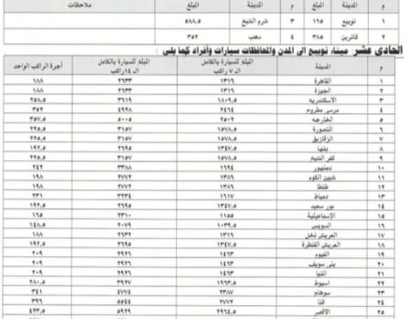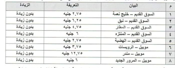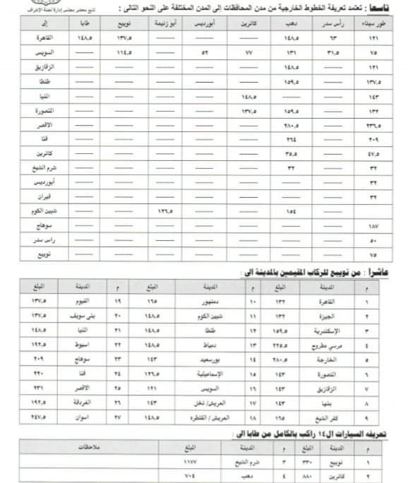 وجاءت قائمة تعريفة الأجرة لخطوط سير سيارات الأجرة الداخلية والخارجية كما هو موضح بالجداول