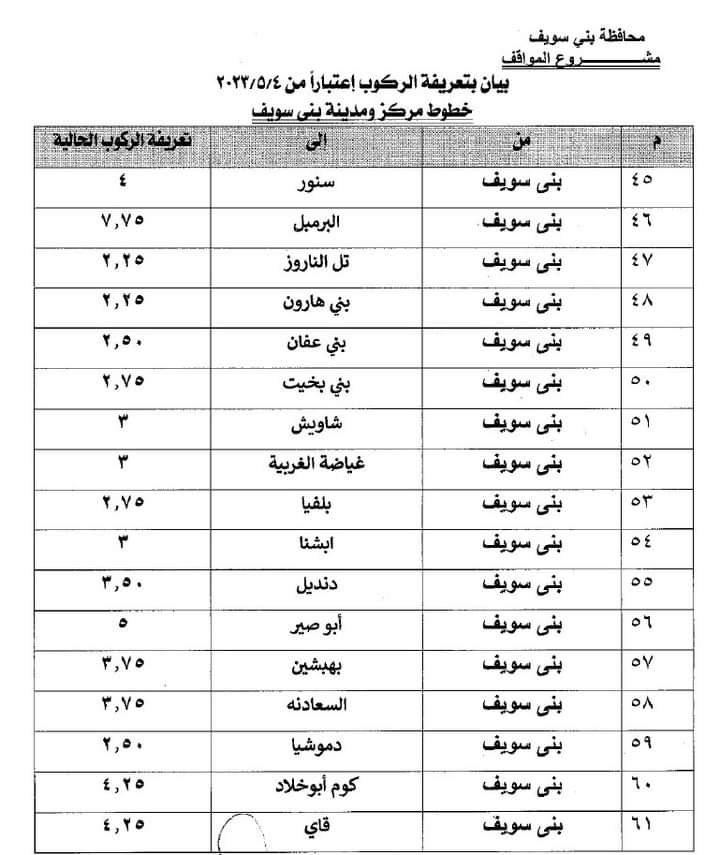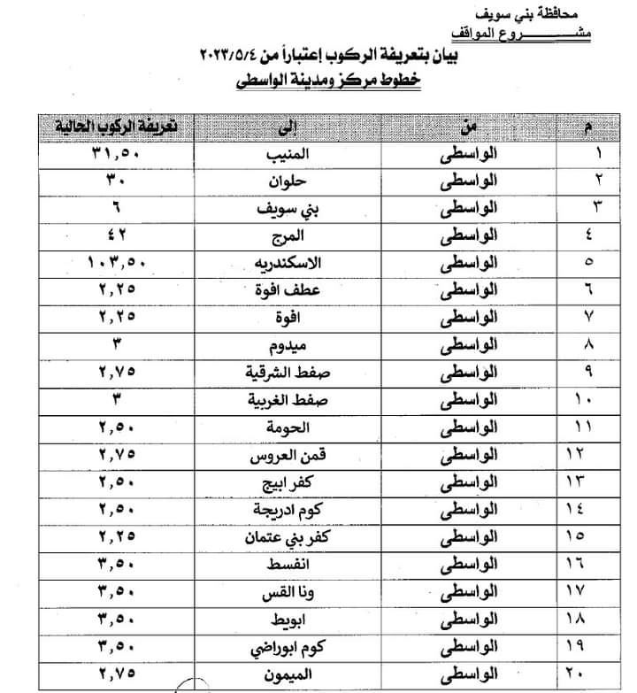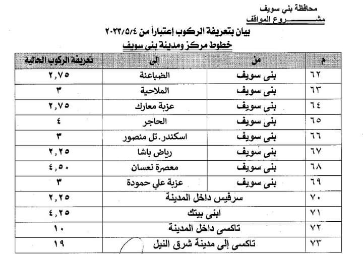 واعتمد الدكتور محمد هاني غنيم محافظ بني سويف، صباح اليوم، تعريفة الركوب الجديدة والتي تقرر زيادتها "بنسبة 10% عن تعريفة الركوب السابقة" على جميع خطوط سير السرفيس والتاكسي وسيارات الأجرة العاملة على الخطوط الداخلية والخارجية بين مراكز المحافظة، والمحافظات الأخرى، وذلك في ضوء قرار لجنة التسعير التلقائي للمواد البترولية بتحريك سعر السولار، اعتبارًا من الساعة 2 صباح اليوم الخميس.
