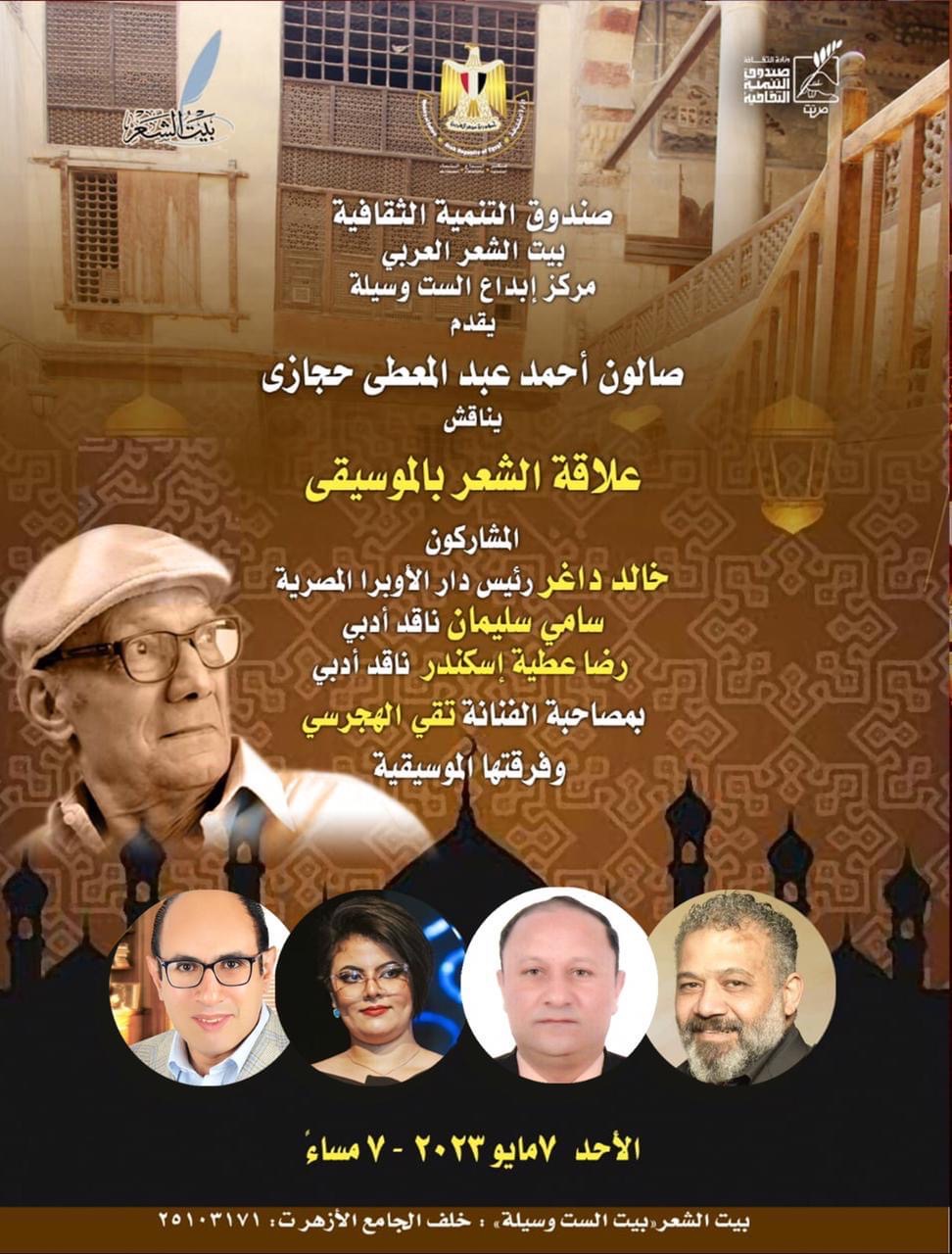 يقيم بيت الشعر العربي بمركز إبداع الست وسيلة خلف الجامع الأزهر، التابع لقطاع صندوق التنمية الثقافية، في السابعة مساء الأحد 7 مايو، صالون "الشاعر الكبير أحمد عبدالمعطي حجازي".
