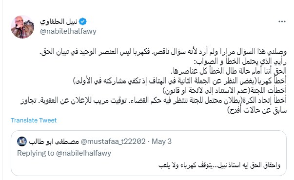 وكتب نبيل الحلفاوي، تعليقًا على أزمة كهربا، بتغريدة عبر تويتر "وصلني هذا السؤال مرارا ولم أرد لأنه سؤال ناقص. فكهربا ليس العنصر الوحيد في تبيان الحق. رأيي الذي يحتمل الخطأ والصواب: الحق أننا أمام حالة طال الخطأ كل عناصرها."