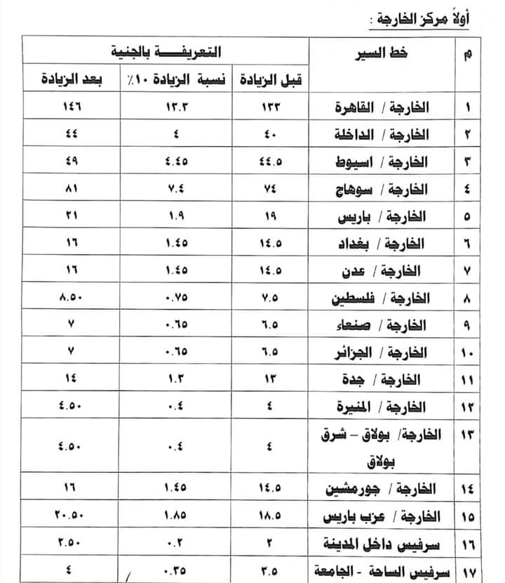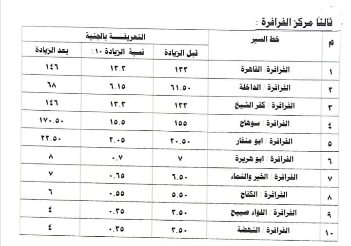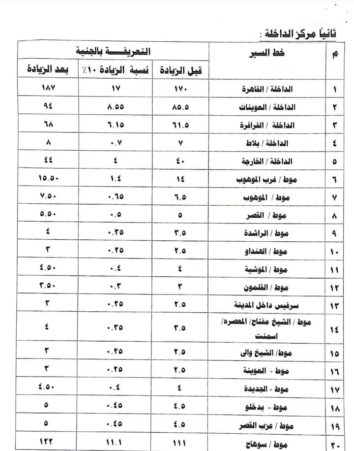 واعتمد دكتور لواء محمد الزملوط محافظ الوادي الجديد، التعريفة الجديدة لنقل الركاب بمواقف سيارات الأجرة والسرفيس بمختلف مراكز ومدن المحافظة، وجاءت كالآتي: