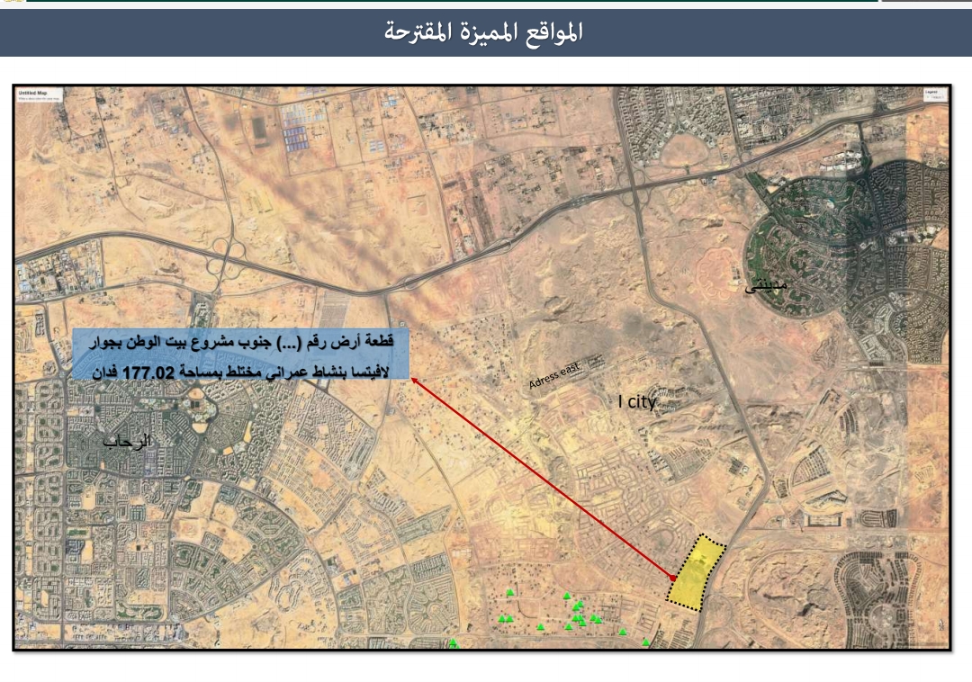 قطعة أرض رقم (...) جنوب مشروع بيت الوطن بجوار لافينسا - بنشاط عمراني مختلط بمساحة 177.02 فدان وسعرها التقديري 11505 جنيه مصري للمتر مربع.