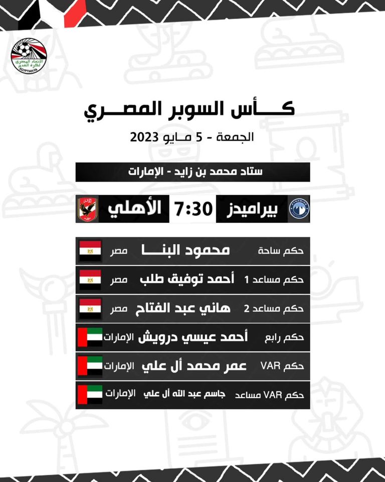 السوبر المصري، أسندت لجنة الحكام الرئيسية باتحاد الكرة برئاسة البرتغالي فيتور بيريرا إدارة مباراة الأهلي أمام بيراميدز في السوبر المصري إلى الحكم الدولي محمود البنا في اللقاء المقرر إقامته مساء اليوم الجمعة على ملعب محمد زايد بالعاصمة الإماراتية أبوظبي.