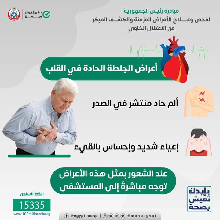 حذرت وزارة الصحة من تجاهل أعراض الإصابة بالجلطة الحادة في القلب التي تشمل: