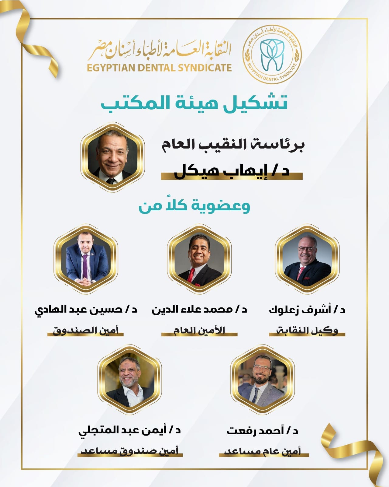 أعلنت النقابة العامة لأطباء الأسنان، برئاسة الدكتور إيهاب هيكل النقيب العام، التشكيل الجديد لهيئة المكتب بالنقابة العامة وجاء كالآتي: