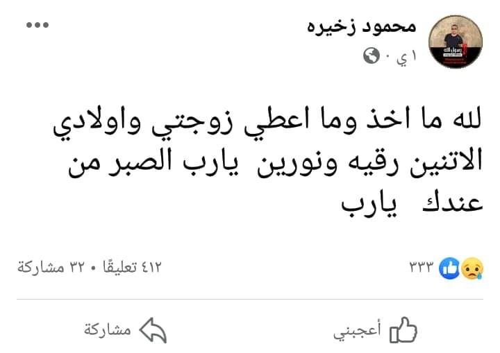 نشر محمود توفيق ذخيرة، زوج السيدة المتوفاة ووالد الصغيرتين، نعي وفاتهن عبر صفحته الشخصية على موقع التواصل الاجتماعي فيسبوك، بكلمات مؤثرة، صنعت حالة من الحداد على كافة أروقة مواقع التواصل الاجتماعي بالواحات، حيث جاء نص النعي كالآتي: لله ما أخذ وما أعطى.. زوجتي وأولادي الاثنتين رقية ونورين.. يارب الصبر من عندك يارب.