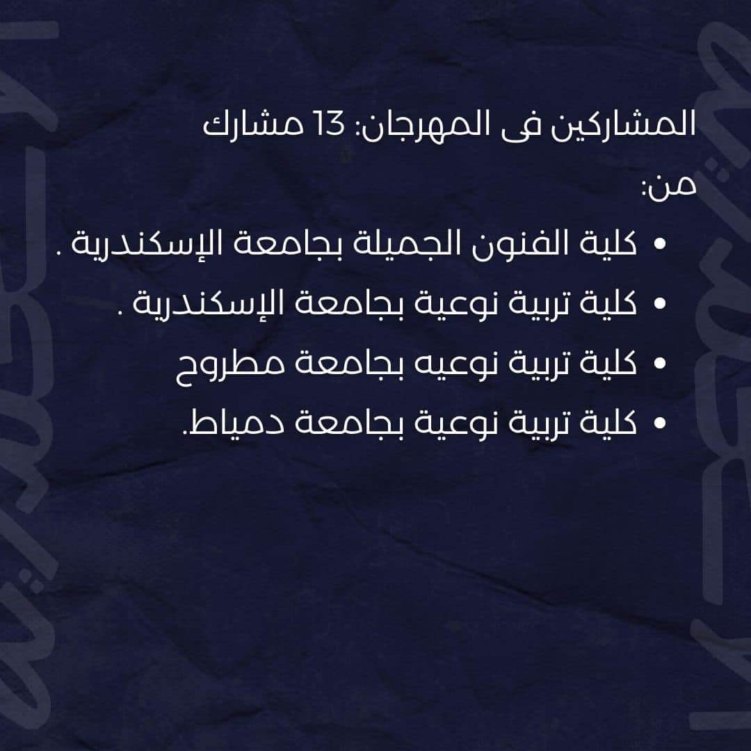 ومن جانبه؛ أوضح الدكتور محمد عبد الرازق، أن الادارة المركزية للسياحة والمصايف، لم ولن تدخر جهدا لكي تظهر شواطئ الإسكندرية بالشكل الذي يليق بها أمام أهلها وزائريها، مضيفا بأن هذا المهرجان هو الأول من نوعه الذي تستضيفه شواطئ الإسكندرية، مشيرا إلى أن عدد المشاركين في المهرجان هم 13 مشارك من (كلية الفنون الجميلة بجامعة الإسكندرية - وكلية التربية النوعية بجامعة الإسكندرية -وكلية التربية النوعية بجامعة مطروح - وكلية التربية النوعية بجامعة دمياط) وسيتم اختيار 3 فائزين من المشاركين فى المهرجان للحصول على جوائز قيمة.