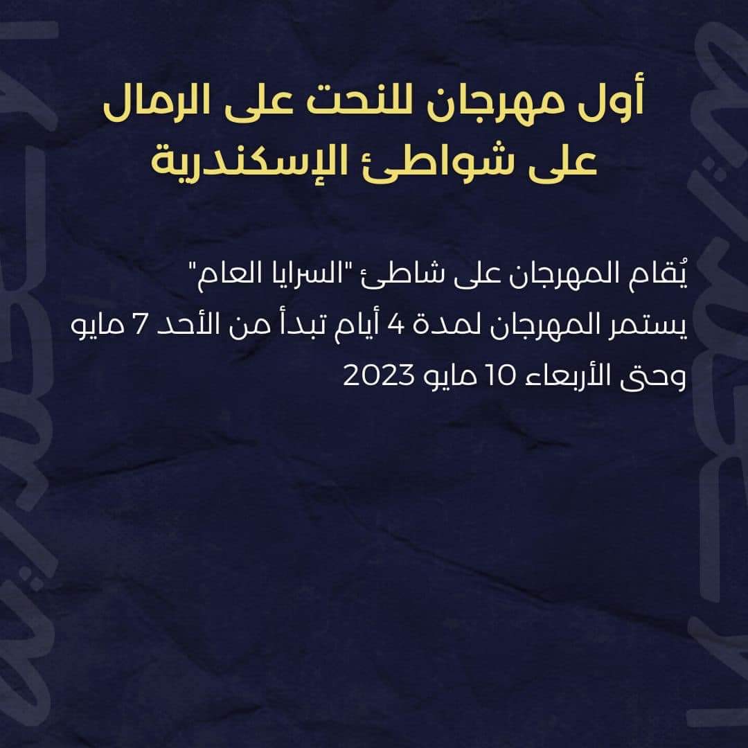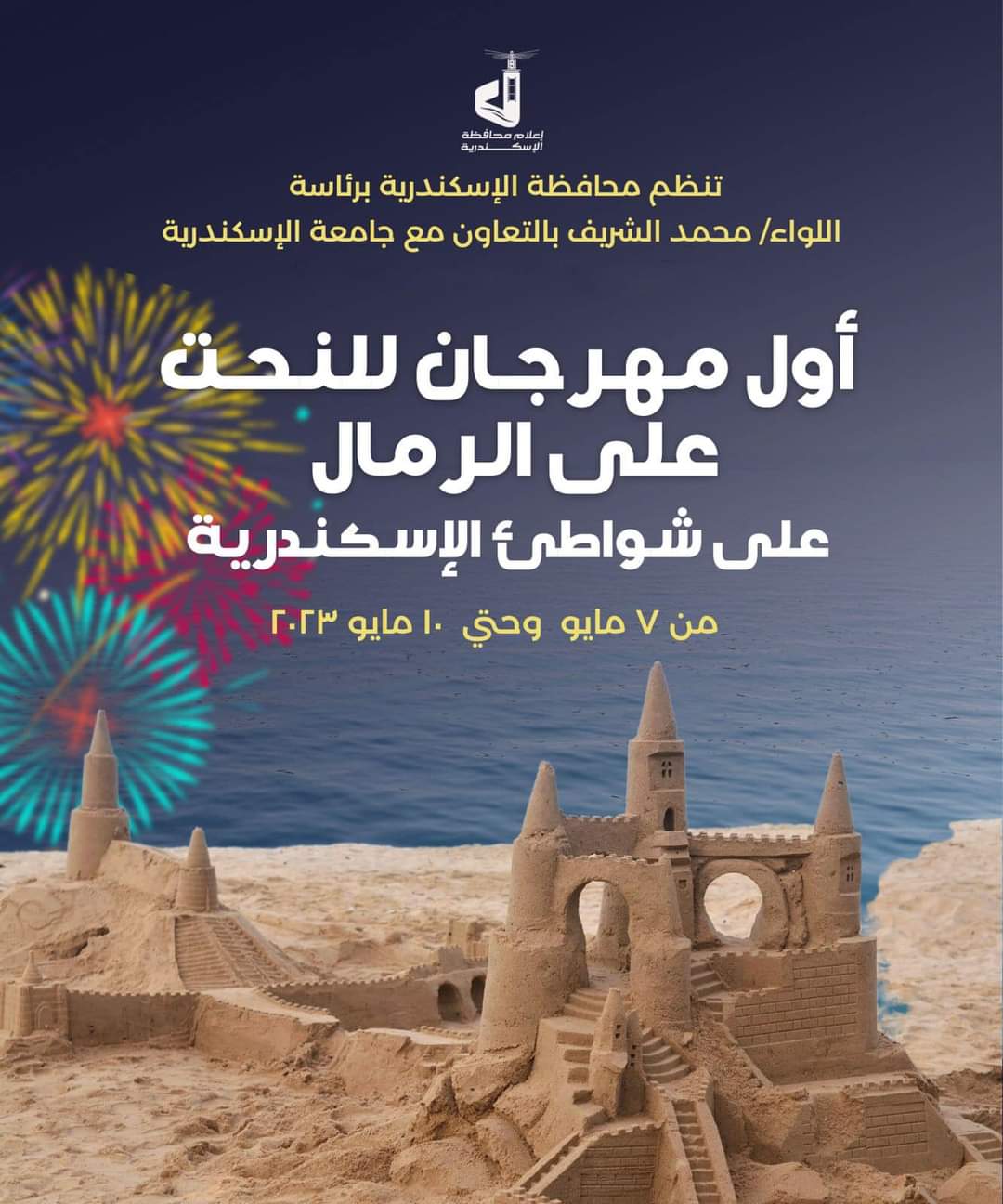 أعلن اللواء محمد الشريف محافظ الإسكندريةعن تنظيم "مهرجان للنحت على الرمال على شواطئ الإسكندرية" بالتعاون مع جامعة الإسكندرية برئاسة الدكتور عبد العزيز قنصوة، والذي مقرر له أن يُقام على شاطئ "السرايا العام"، ويستمر لمدة 4 أيام تبدأ من الأحد 7 مايو وحتى الأربعاء 10 مايو 2023، مؤكدا على دعم المحافظة لجميع الأنشطة الرياضية والفعاليات الترفيهية المختلفة على شواطئ الإسكندرية.