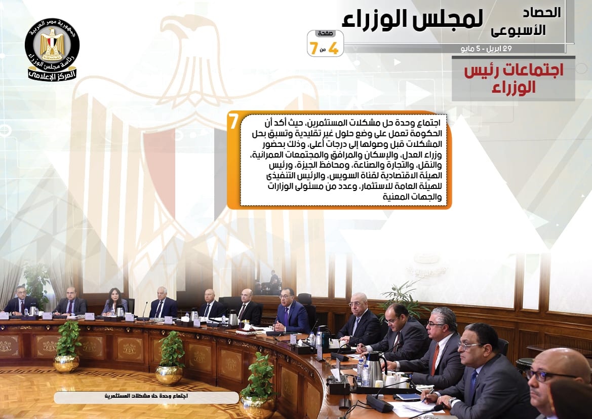 أما عن اللقاءات التي عقدها رئيس مجلس الوزراء على مدار الأسبوع، أورد التقرير لقاء مع رئيس وزراء اليابان على هامش مشاركتهما في فعاليات منتدى الأعمال المصري الياباني، حيث أكد ترحيب مصر الكبير بالاستثمارات اليابانية وتطلع الحكومة لمنح الرخصة الذهبية لمزيد الشركات اليابانية، بالإضافة إلى لقاء مع وزيرة التخطيط والتنمية الاقتصادية، رئيس مجلس إدارة صندوق مصر السيادي؛ لمتابعة الجهود الحالية للترويج للفرص الاستثمارية، وجذب المزيد من الاستثمارات المحلية والأجنبية المباشرة، وذلك بحضور المدير التنفيذي للصندوق، فضلًا عن لقاء مع رئيس مجلس إدارة شركة أبوظبي القابضة، حيث أكد استمرار جهود الدولة المصرية في تنفيذ واتخاذ العديد من الخطوات والإجراءات التي من شأنها تهيئة مناخ جاذب للاستثمارات المحلية والأجنبية لمختلف القطاعات، وذلك بحضور وزيرة التخطيط والتنمية الاقتصادية، والرئيس التنفيذي لصندوق مصر السيادي، بجانب لقاء مع نائب رئيس شركة أباتشي العالمية، مدير أباتشي مصر، لاستعراض استثمارات شركة أباتشي في مصر وخططها المستقبلية، وذلك بحضور وزير البترول والثروة المعدنية.