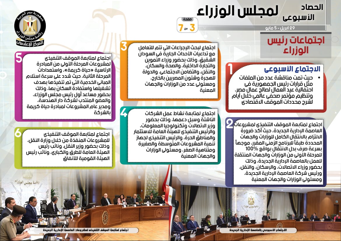 أما عن الاجتماعات التي عقدها رئيس مجلس الوزراء أورد التقرير، اجتماعا لمتابعة الموقف التنفيذي لمشروعات العاصمة الإدارية الجديدة، حيث أكد ضرورة الالتزام بالانتقال الكامل للوزارات والجهات المحددة طبقًا للبرنامج الزمني المقرر، موجهًا بسرعة صرف بدل الانتقال بواقع 100% للمرحلة الأولى من الوزارات والجهات المنتقلة للعمل بالعاصمة الإدارية الجديدة، وذلك بحضور وزراء الاتصالات، والإسكان، والنقل، ورئيس شركة العاصمة الإدارية الجديدة، ومسئولي الوزارات والجهات المعنية، بالإضافة إلى اجتماع لبحث الإجراءات التي تتم للتعامل مع تداعيات الأحداث الجارية في السودان الشقيق، وذلك بحضور وزراء التموين والتجارة الداخلية، والصحة والسكان، والنقل، والتضامن الاجتماعي، والدولة للهجرة وشئون المصريين بالخارج، ومسئولي عدد من الوزارات والجهات المعنية، فضلًا عن اجتماع لمتابعة نشاط عمل الشركات الناشئة وسبل دعمها، وذلك بحضور وزير الاتصالات وتكنولوجيا المعلومات، والرئيس التنفيذي للهيئة العامة للاستثمار والمناطق الحرة، والرئيس التنفيذي لجهاز تنمية المشروعات المتوسطة والصغيرة ومتناهية الصغر، ومسئولي الوزارات والجهات المعنية، وكذلك اجتماع لمتابعة الموقف التنفيذي لمشروعات المرحلة الأولى من المبادرة الرئاسية "حياة كريمة"، واستعدادات المرحلة الثانية، حيث شدد على سرعة استلام المباني الخدمية التي تم تنفيذها بهدف تشغيلها واستفادة السكان بها، وذلك بحضور مساعد أول رئيس مجلس الوزراء، والعضو المنتدب لشركة دار الهندسة، ومدير عام المشروعات لمبادرة حياة كريمة بالشركة.