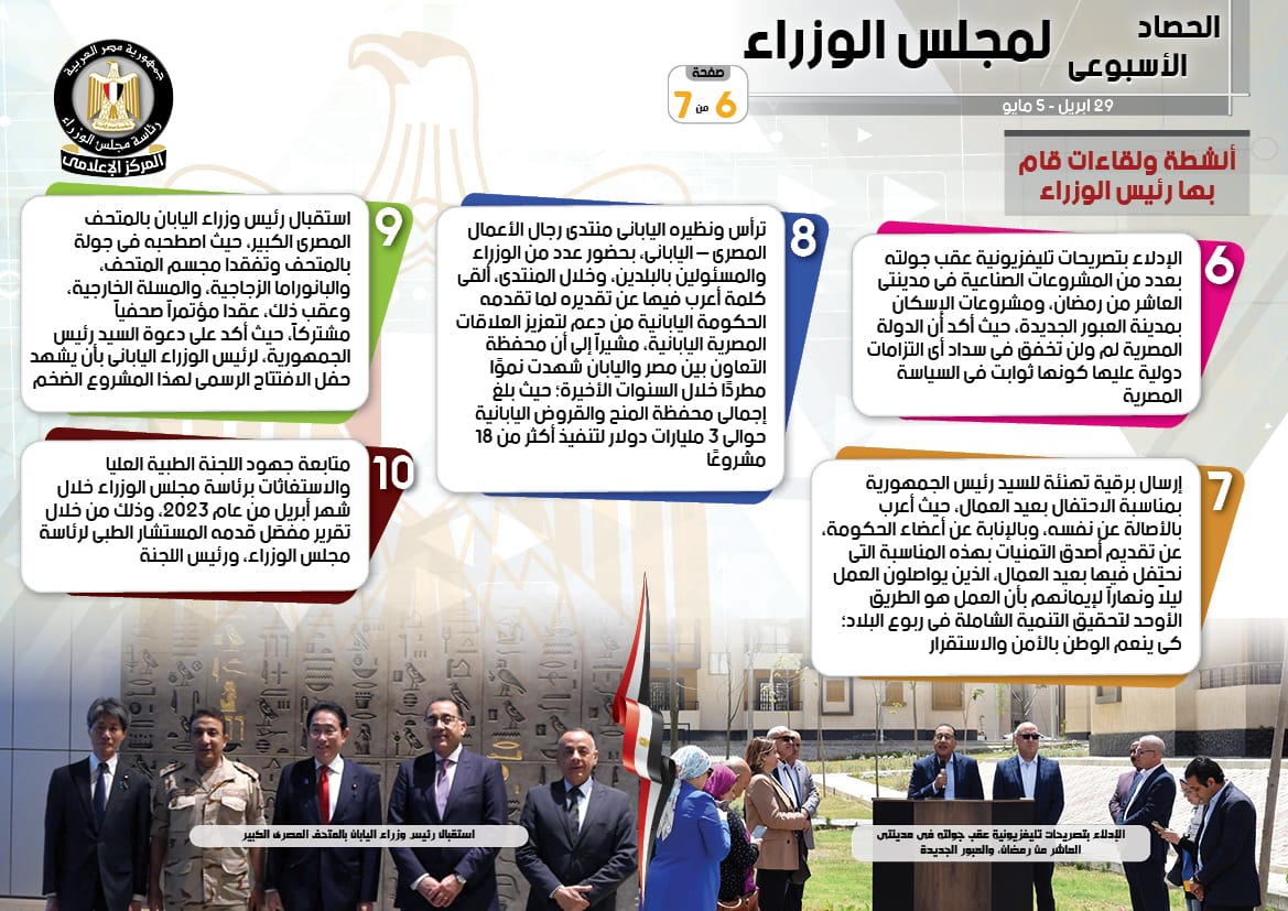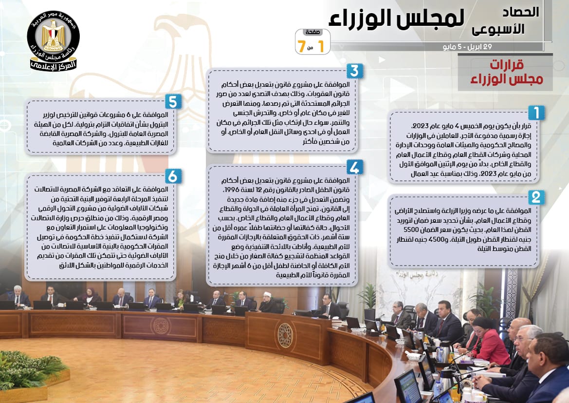 نشر المركز الإعلامي لـ مجلس الوزراء تقريرًا شمل إنفوجرافات سلط من خلالها الضوء على الحصاد الأسبوعي لمجلس الوزراء، وذلك خلال الفترة من 29 أبريل حتى 5 مايو 2023، والذي تضمن الموافقة على عدد من القرارات، فضلًا عن الاجتماعات واللقاءات التي عقدها الدكتور مصطفى مدبولي، رئيس مجلس الوزراء، بالإضافة إلى ما قام به من أنشطة.