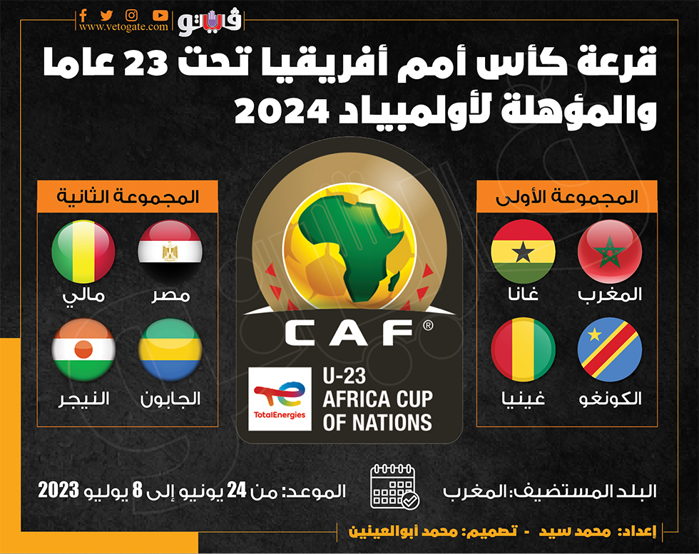 قرعة كأس أمم أفريقيا تحت 23 عاما والمؤهلة لأولمبياد 2024 (إنفوجراف) الجمعة 05/مايو/2023 - 09:41 م 5/5/2023 9:41:32 PM منتخب مصر الأوليمبي، فيتو محمد سيد شارك طباعة 18 حجم الخط شارك طباعة كأس أمم أفريقيا تحت 23 عاما مصر المغرب غانا مالي الجابون النيجر