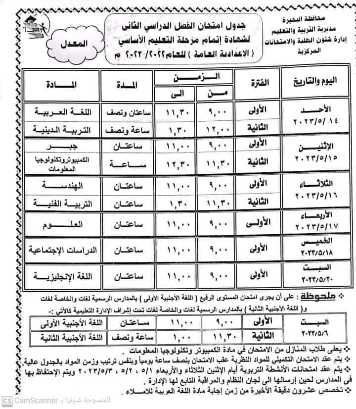 جدول امتحان الشهادة الاعدادية بالبحيرة ٢٠٢٣