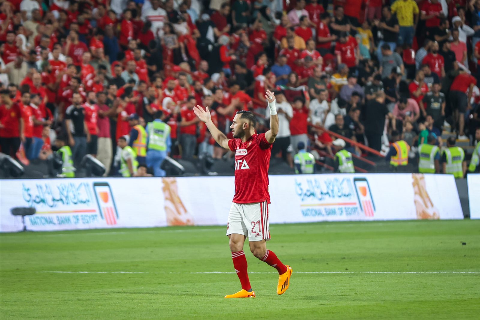 السوبر المصري ، حرص أحمد القندوسي لاعب النادي الأهلي، على التواجد بسيارة الطاقم الطبي والتجول بها داخل ملعب محمد بن زايد عقب تعافي محمود متولي من الإغماء الذي تعرض له.