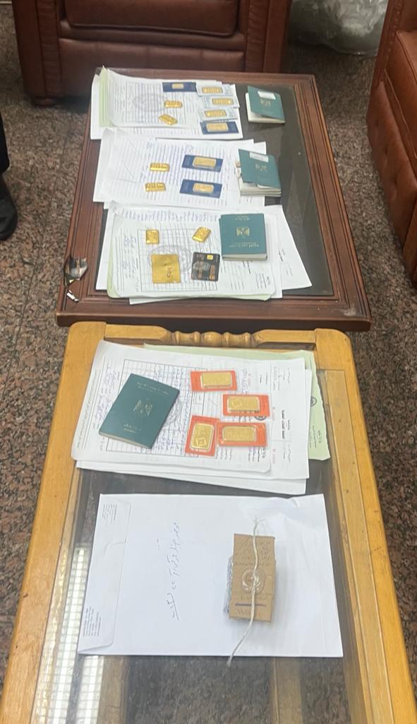 والحالة الثانية كانت أثناء إنهاء الإجراءات الجمركية على ركاب رحلة خطوط فلاي إيجيبت القادمة من الشارقة حيث تم ضبط راكب مصري آخر بحوزته ٤ سبائك ذهبية بوزن إجمالي ٣٣٢ جرامًا منهم اثنان على شكل فيزا كارت لأحد البنوك بوزن ٥٠ جرامًا لكل واحدة واثنان بوزن ١١٦ جرامًا لكل واحدة أخفاهم في جيوبه وعلى جسده تم الضبط بواسطة كل من أشرف أبو الفضل من اللجنة الجمركية وكل من حسام سليمان ومحمد حسن عبد الوهاب مأمورا الجمرك في التفتيش الذاتي بإشراف إكرامي أحمد مدير الحركة.