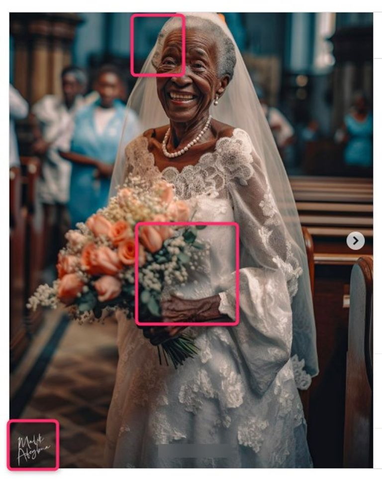 عناصر عدَّة تثير الشكَّ في أن تكون هذه الصورة حقيقيَّة منها التغبُّش على مستوى الرأس وبين يد السيِّدة وباقة الزهور، ما يؤشّر إلى أنَّها قد تكون وليدة برنامج ذكاء اصطناعي، يضاف إلى العناصر المثيرة للشكّ علامة مائيّة أسفل الصورة باسم Malik Afegbua، أرشد البحث عنها إلى حسابٍ في موقع إنستجرام يحمل الاسم نفسه، ويعود لفنّان نيجيريّ عادة ما ينشر تصاميم باستخدام الذكاء الاصطناعي.