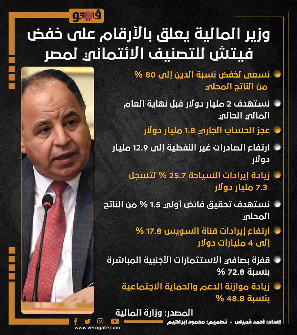 وزير المالية يعلق بالأرقام على خفض فيتش للتصنيف الائتماني لمصر (إنفوجراف) السبت 06/مايو/2023 - 04:06 م 5/6/2023 4:06:16 PM الدكتور محمد معيط وزير المالية أحمد خميس شارك طباعة 18 حجم الخط شارك طباعة فيتش وزير المالية الماليه خفض فيتش للتصنيف الائتماني