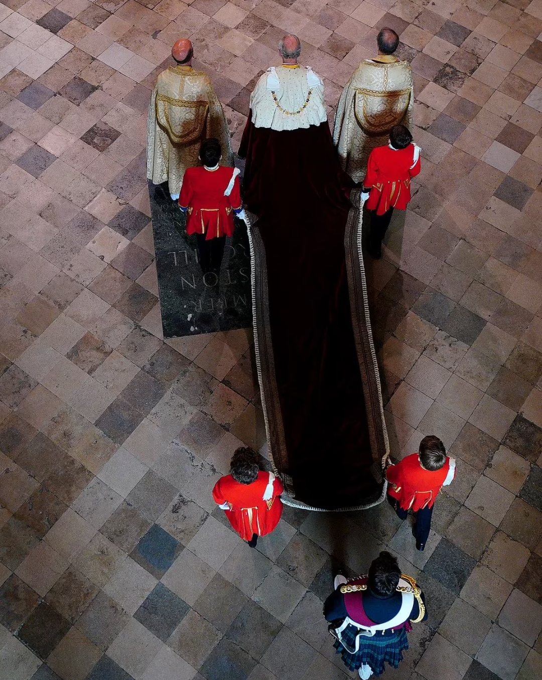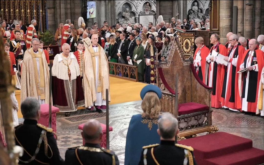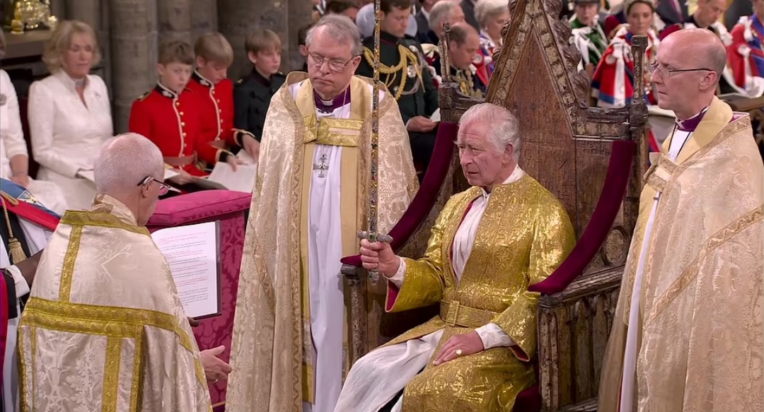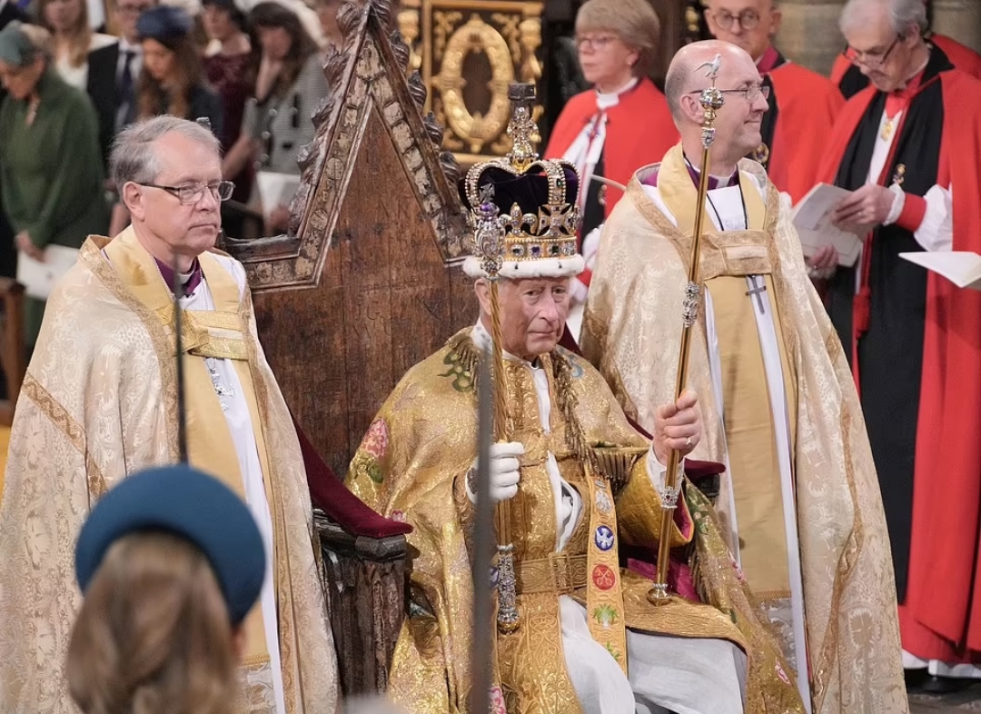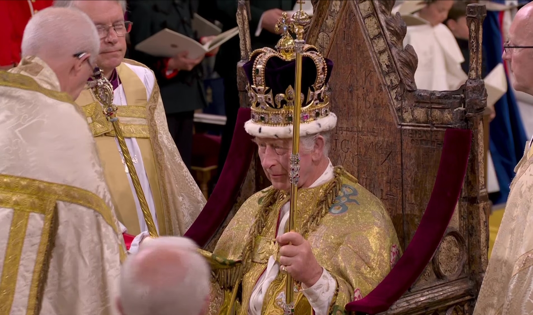 ووضع رئيس أساقفة كانتربري تاج القديس إدوارد علي رأس الملك تشارلز في إطار المراسم المقررة للتتويج.