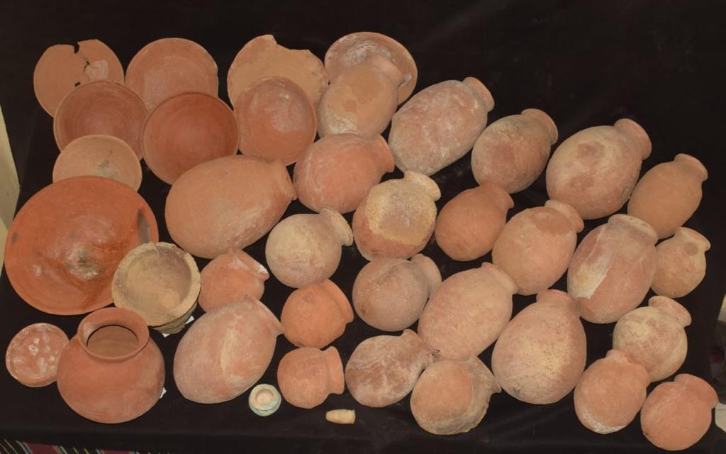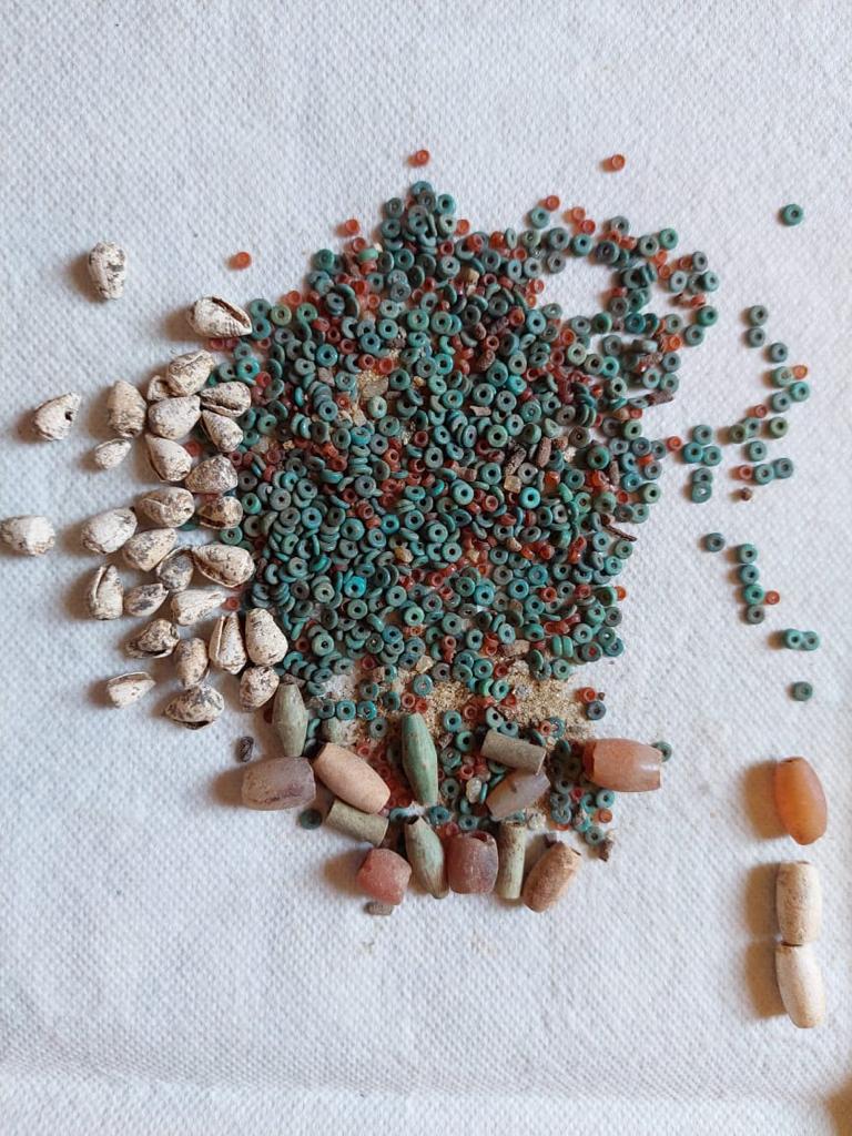 وأما عن الدفنات التي تم الكشف عنها في الجبانة السفلية، فتم العثور داخلها على أجزاء من توابيت خشبية وهياكل عظمية وبعض الأثاث الجنائزى في حالة سيئة من الحفظ، لافتا إلى أن إحدي هذه الدفنات تخص سيدة عثر بداخلها على التابوت الخاص بها في حالة سيئة من الحفظ لم تبق منه سوي قناع وكفين وأجزاء من الصدر، بالإضافة إلى عدد من الأوانى الفخارية مختلفة الأشكال والأحجام ومجموعة من الخرز المصنوع من الفيانس الأزرق والأسود ومراَتين من النحاس.