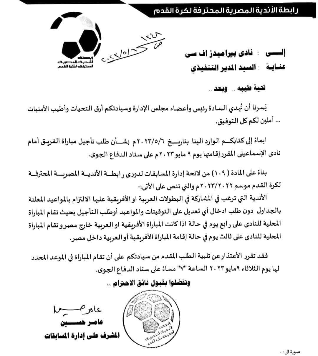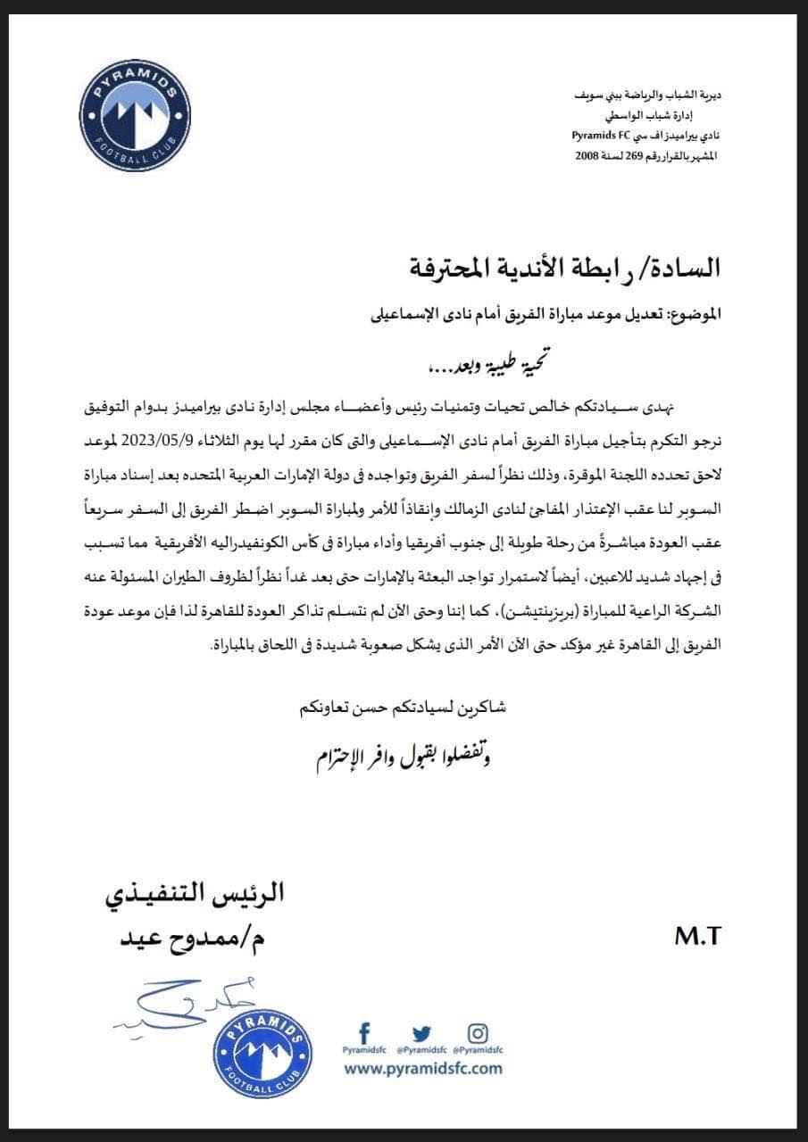 أضاف المدير الرياضي أن النادي طلب حقا مشروعا بتأجيل مباراة الإسماعيلي بعدما أنقذ سمعة الكرة المصرية وشارك رغم ضيق الوقت في مباراة السوبر بالإمارات أمام الأهلي، وبسبب التأخير في موعد عودته إلى القاهرة بسبب ظروف الطيران الخارجة عن إرادته والمسئول عنها اتحاد الكرة منظم مباراة السوبر بالإمارات.