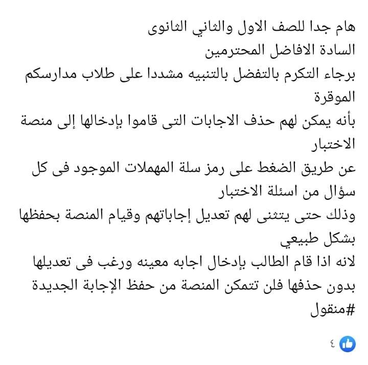 ومن جانبه، أكد شادي زلطة المتحدث الرسمي باسم وزارة التربية والتعليم عبر جروب حوار مجتمعي، أن المنشور الذي تم تداوله غير صحيح بالمرة، لافتا إلى أنه يحق للطالب التغيير بين الاجابات مباشرة بدون اللجوء لأي خطوة إضافية.